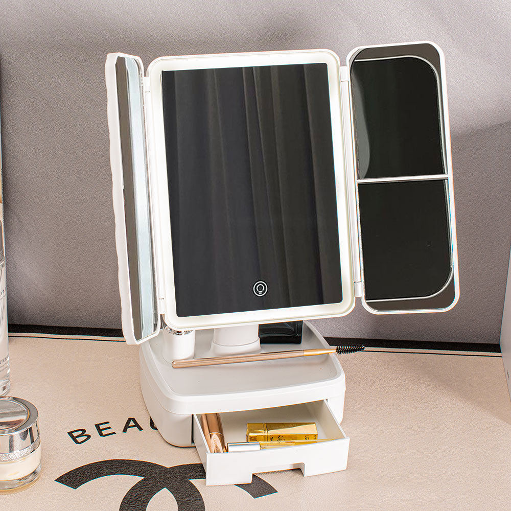 This elegant tri-fold shell LED vanity mirror offers a stylish and multifunctional solution for your beauty routine. Featuring built-in LED lights for optimal illumination, a convenient storage drawer for makeup essentials, and an adjustable tri-fold design, it combines practicality with aesthetic appeal. Its sleek white finish makes it suitable for daily use or as a thoughtful gift.