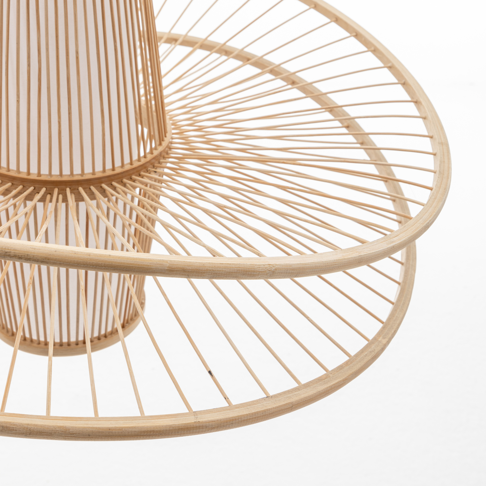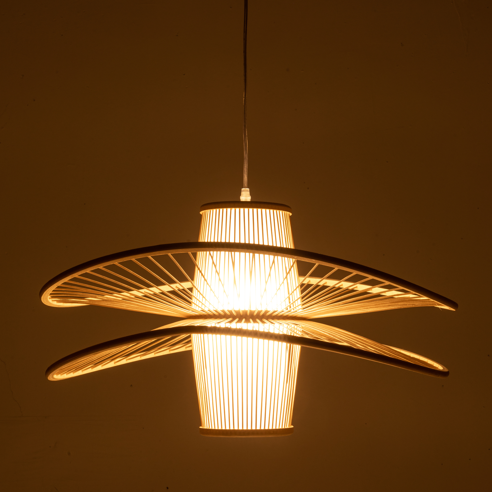 This pendant lamp features a double-layered hand-woven bamboo design, combining natural elegance with contemporary style. It serves as a versatile lighting solution suitable for various interior spaces, offering soft ambient illumination and a sophisticated aesthetic.
