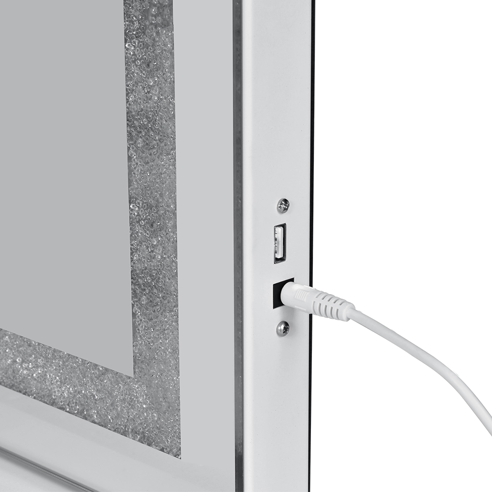 This illuminated makeup mirror features a large size and a stylish frame, providing an ideal setup for detailed makeup application. The mirror is equipped with adjustable LED light strips that offer customizable brightness and color temperature options, including warm, natural, and cool lighting. It can be used as a free-standing unit or wall-mounted to suit your space. Additionally, it includes a built-in Bluetooth speaker and a USB charging port for added convenience.