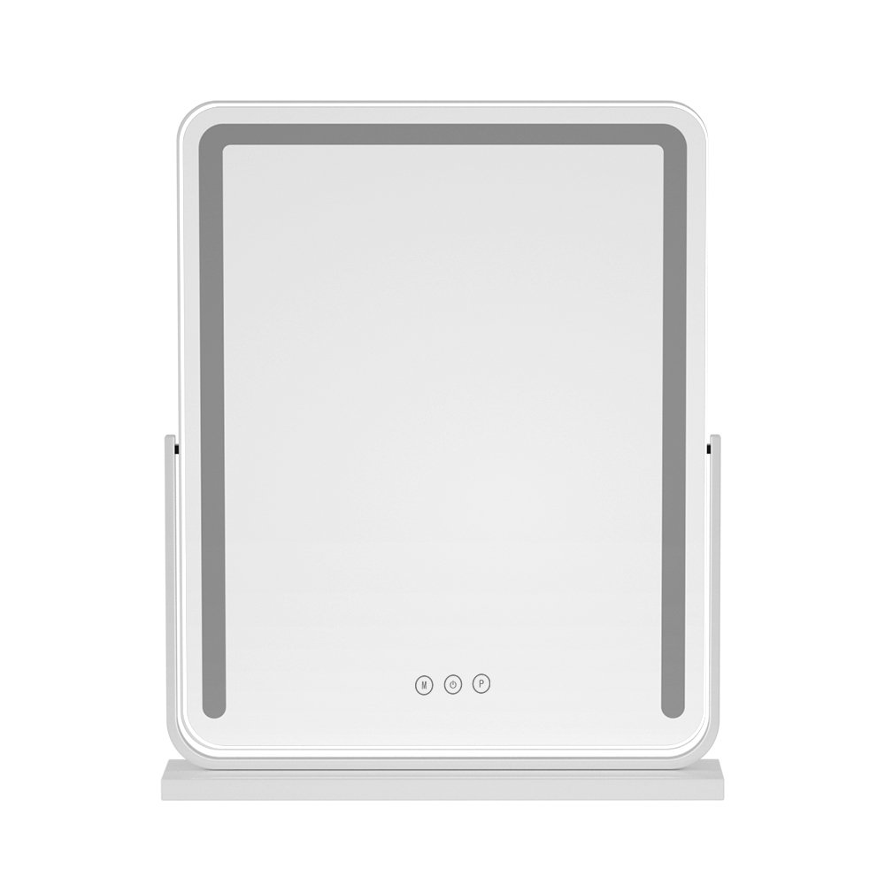 This makeup mirror features a large 40x50cm size with a sturdy aluminium frame and a stable metal base. It is designed to provide optimal lighting for daily makeup routines, with adjustable LED light strips that enhance visibility and precision. The mirror can be rotated up to 180 degrees for the perfect viewing angle, making it a versatile addition to any vanity or bathroom setup. Equipped with intelligent touch controls, users can easily adjust brightness and color temperature to suit their preferences, creating a professional and illuminated makeup environment.