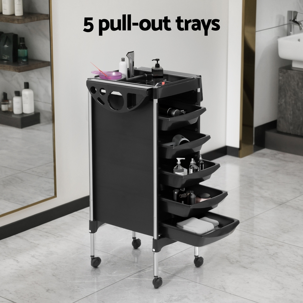 This salon trolley features a sleek and stylish design with a sturdy metal frame, making it both practical and elegant for beauty salons. It offers ample storage with six tiers and includes multiple pull-out and foldable side trays, all mounted on mobile wheels for easy movement.