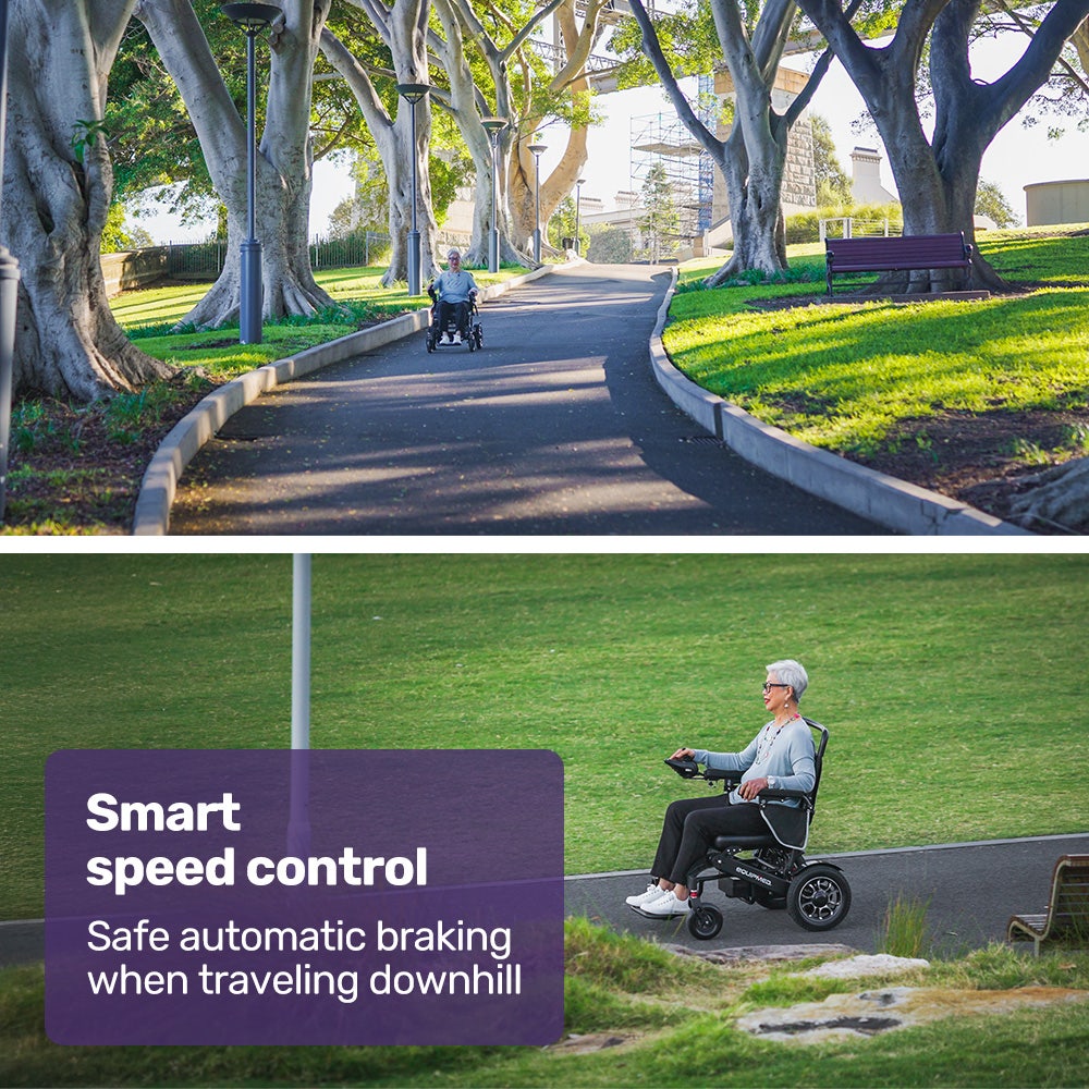 - Safety features including seat belt, anti-tip wheels, dual park brake, and smart speed control