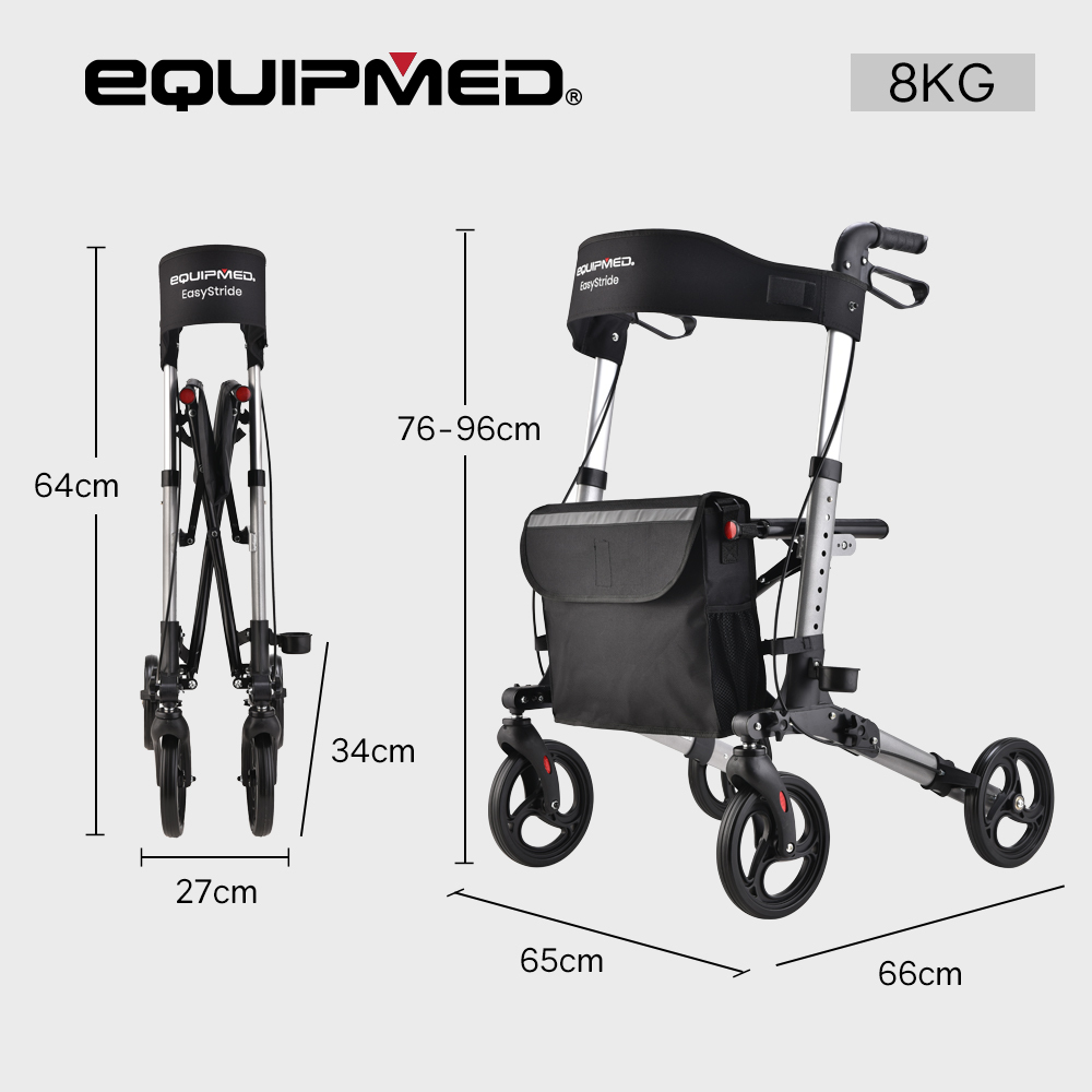 EQUIPMED Foldable Aluminium Walking Frame Rollator with Bag and Seat, Silver