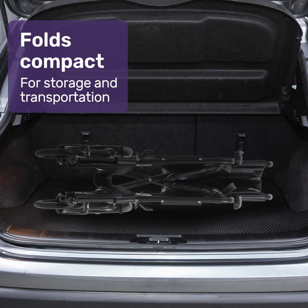 This folding transit wheelchair is designed for easy transportation and reliable performance. It features a sturdy steel frame, wide seat, and comfortable armrests, making it suitable for users with short-term mobility needs. The wheelchair is equipped with puncture-proof wheels, park brakes, and a quick folding mechanism for convenience and safety.
