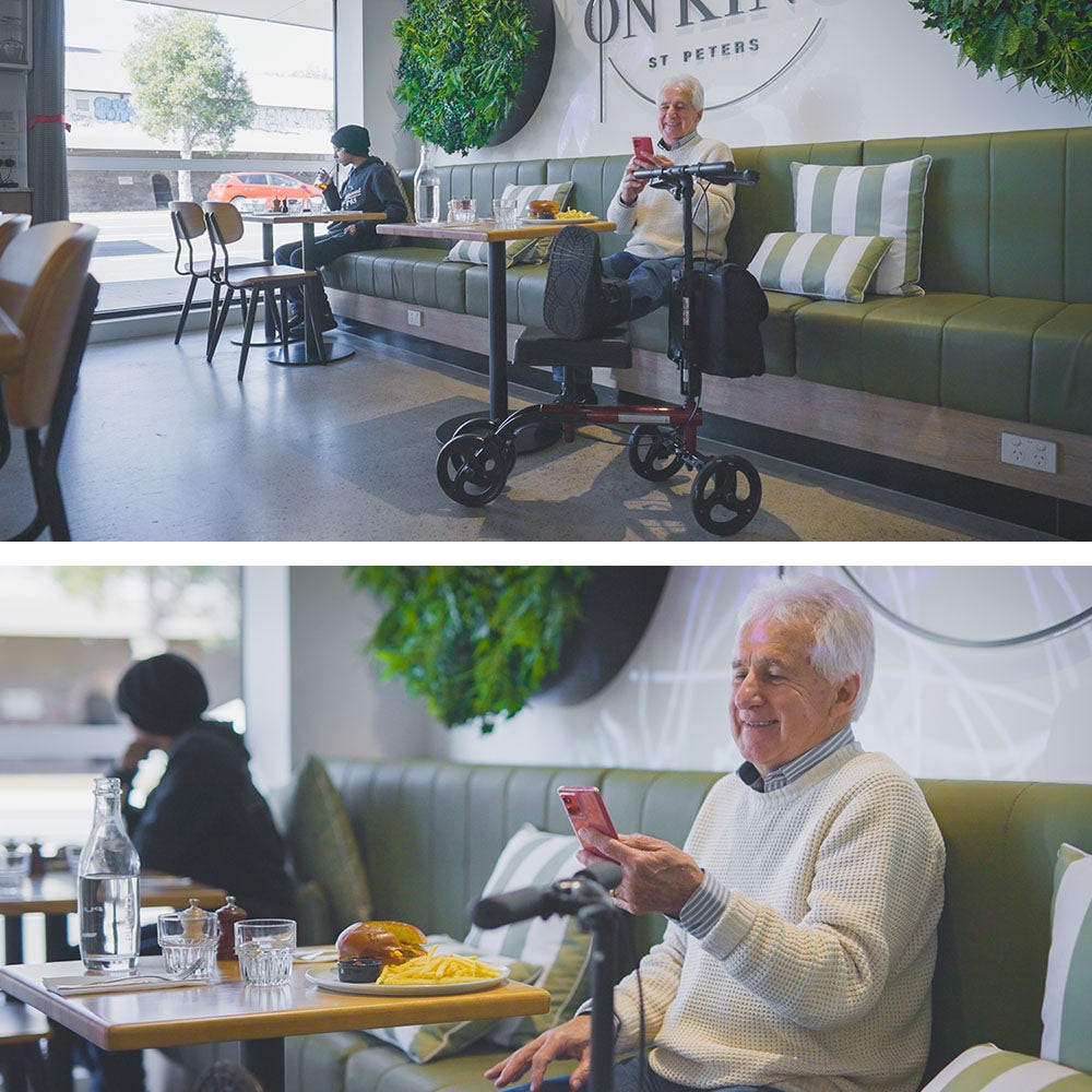 This knee scooter walker provides a comfortable and efficient alternative to crutches for individuals recovering from foot or ankle injuries. It features a sturdy steel frame, dual brakes for safety, and adjustable components to suit users of all ages. The design includes large puncture-proof wheels, a removable storage bag, and a foldable structure for easy transport and storage.