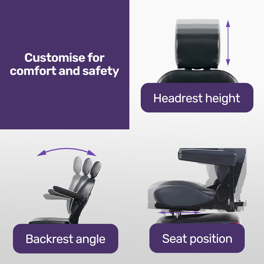 - Large-sized model with adjustable armrests, seat, and headrest for all riders