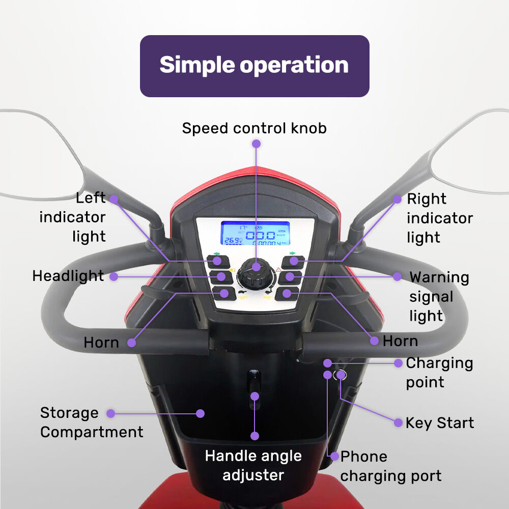 This heavy-duty mobility scooter is designed for stability, comfort, and versatility, supporting riders up to 200kg. It features adjustable components for a personalized fit, a smooth ride over varied terrain, and convenient features for everyday use.