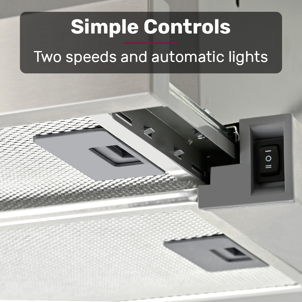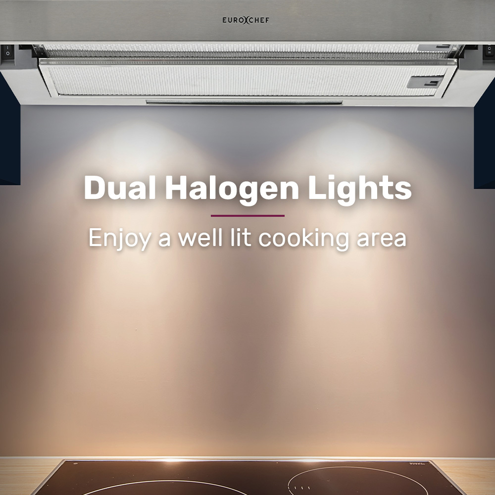 EUROCHEF 60cm Slideout Stainless Steel Rangehood, Quiet 2-Speed, 3-Layer Dishwashable Filters, Halogen Lights ESR60S