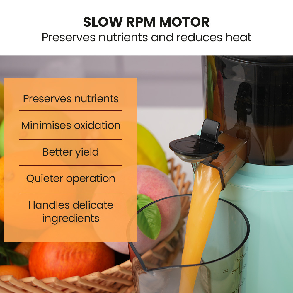 This cold press slow juicer combines efficiency, ease of use, and modern design to help you create fresh, nutrient-rich juices at home. It features a powerful motor, a large feed chute, and advanced technology to ensure smooth operation and maximum juice extraction. Its quiet operation and easy cleaning make it suitable for daily use in any kitchen.