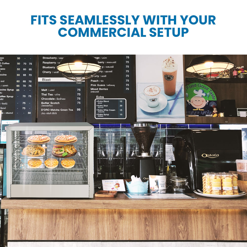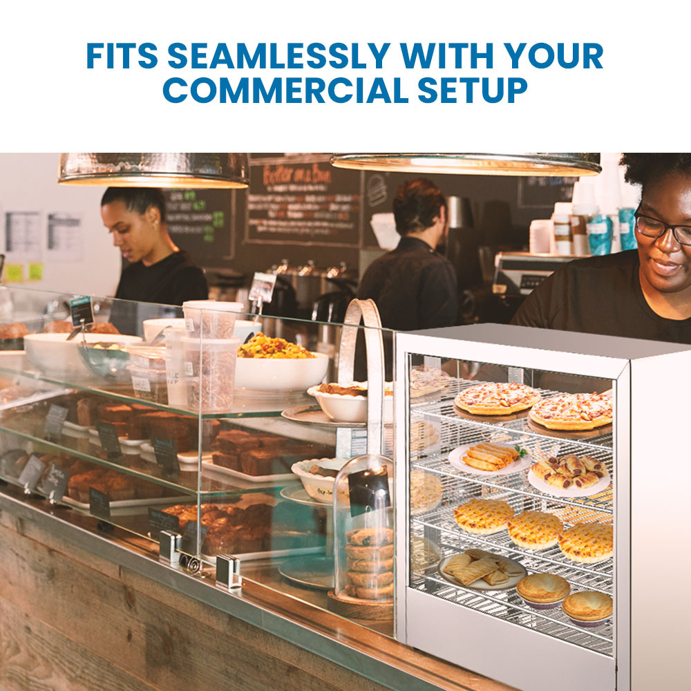 This electric food warmer display features a durable stainless steel construction, providing a sleek appearance and easy cleaning. Its spacious design allows for increased storage capacity, making it suitable for high-volume commercial use. The unit is equipped with efficient heating elements and adjustable temperature controls to keep food at the desired warmth, ensuring food remains fresh and appealing. It includes multiple shelves for organized presentation and easy access, making it ideal for cafes, bakeries, and food vendors.