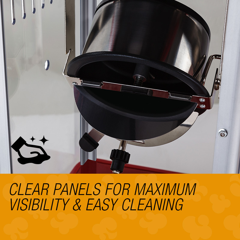 This popcorn machine offers a fun and easy way to make homemade popcorn with a retro style design. It features a transparent casing and access hatch to watch the popping process, along with a stainless steel kettle and crank handle for serving. The appliance is suitable for creating cinema-style popcorn quickly and conveniently at home.