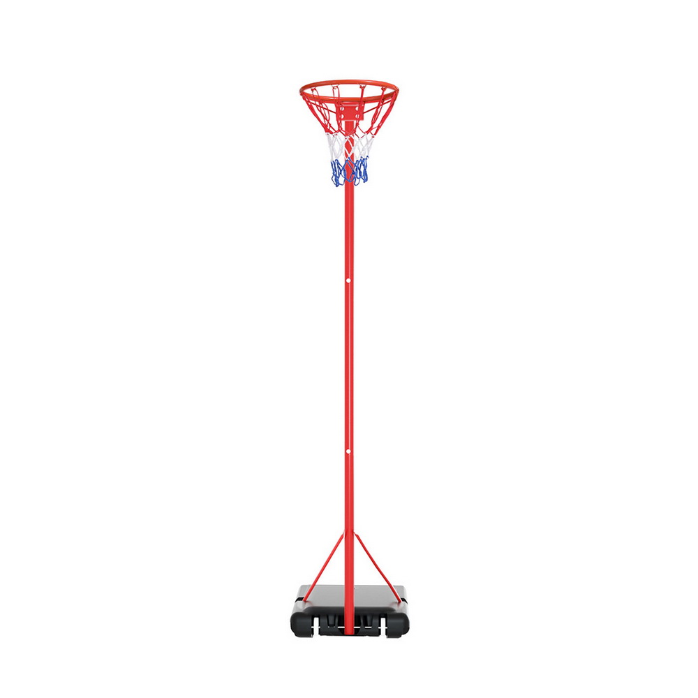This netball hoop system features a durable steel frame and a sturdy base, making it suitable for players of all ages and skill levels. It offers adjustable height settings to accommodate different players and playing environments, with easy setup and stability provided by a fillable base.