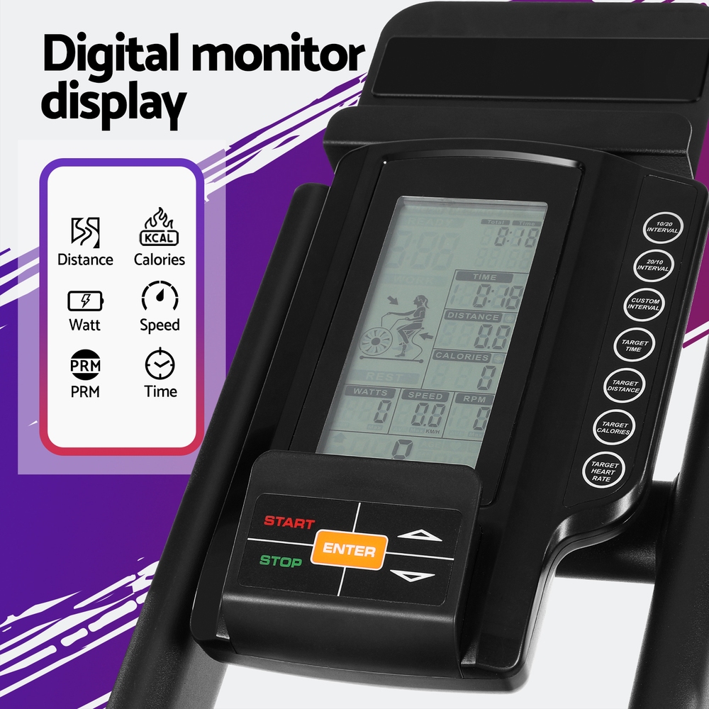 - Digital monitor displaying time, distance, calories, watt, speed, and PRM