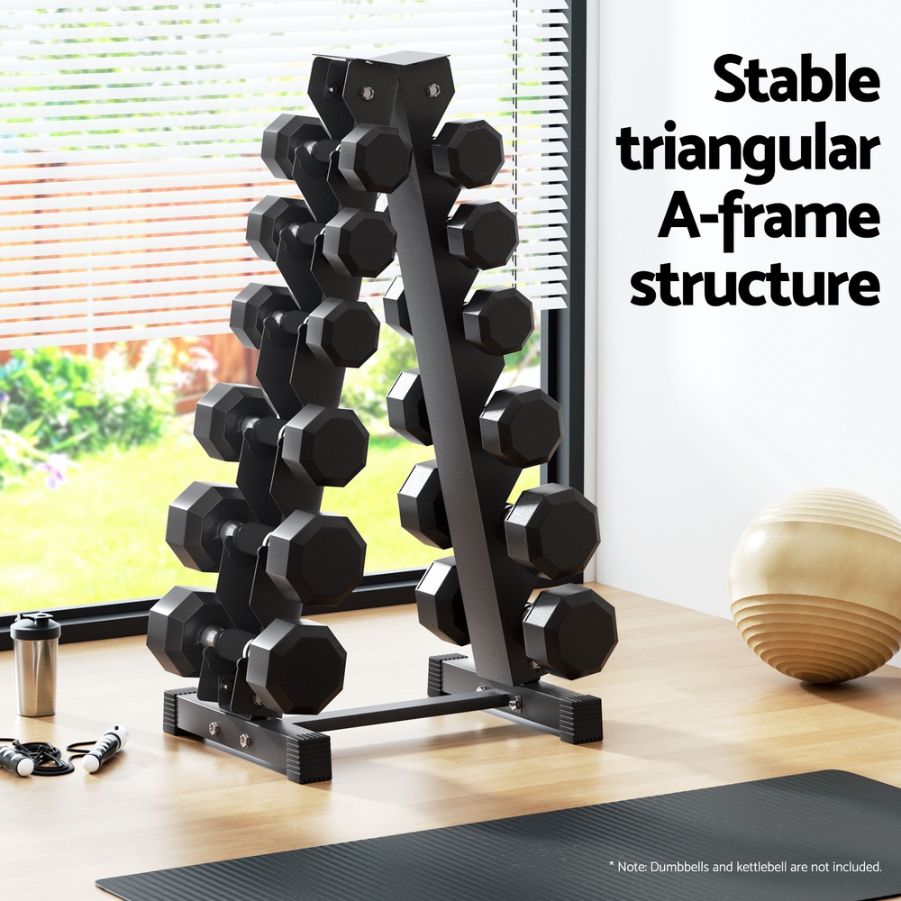 This 6-tier dumbbell rack provides an organized and space-efficient storage solution for your workout equipment. Its stable A-frame triangular design supports up to 200kg of weights, ensuring safety and durability during use. The rack is easy to assemble and suitable for home gyms or fitness studios, helping you keep your weights accessible and neatly arranged.