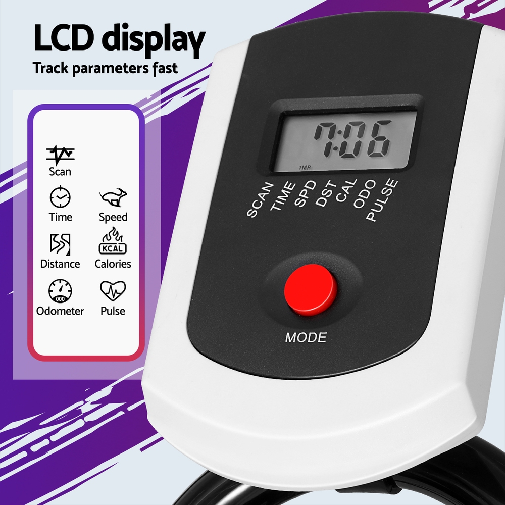 This spin bike is designed for effective cardio workouts at home, featuring a heavy flywheel for smooth and realistic riding. It offers adjustable resistance, a comfortable seat, and handlebars to accommodate various fitness levels. The digital monitor tracks key workout metrics, and the compact design allows for easy storage and transportation.