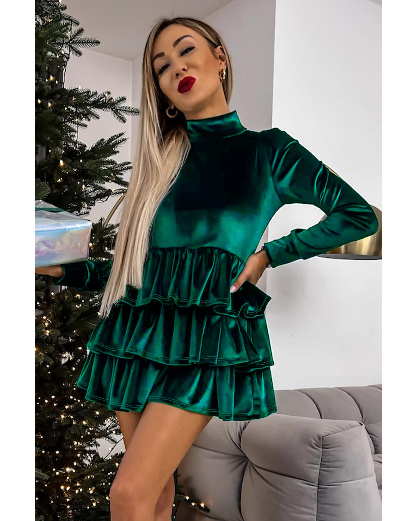 Evergreen Velvet High Neck Tiered Ruffle Mini Dress – M