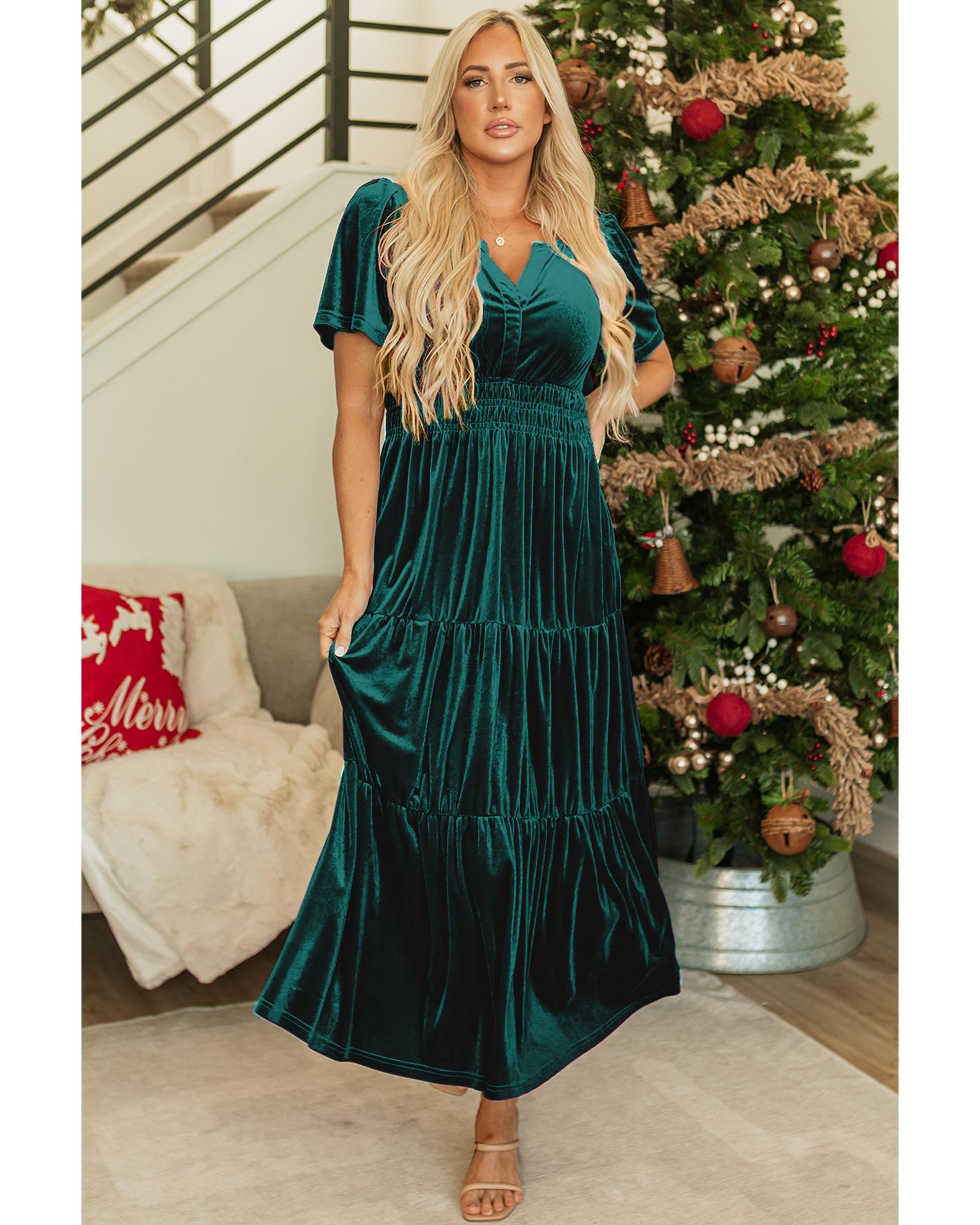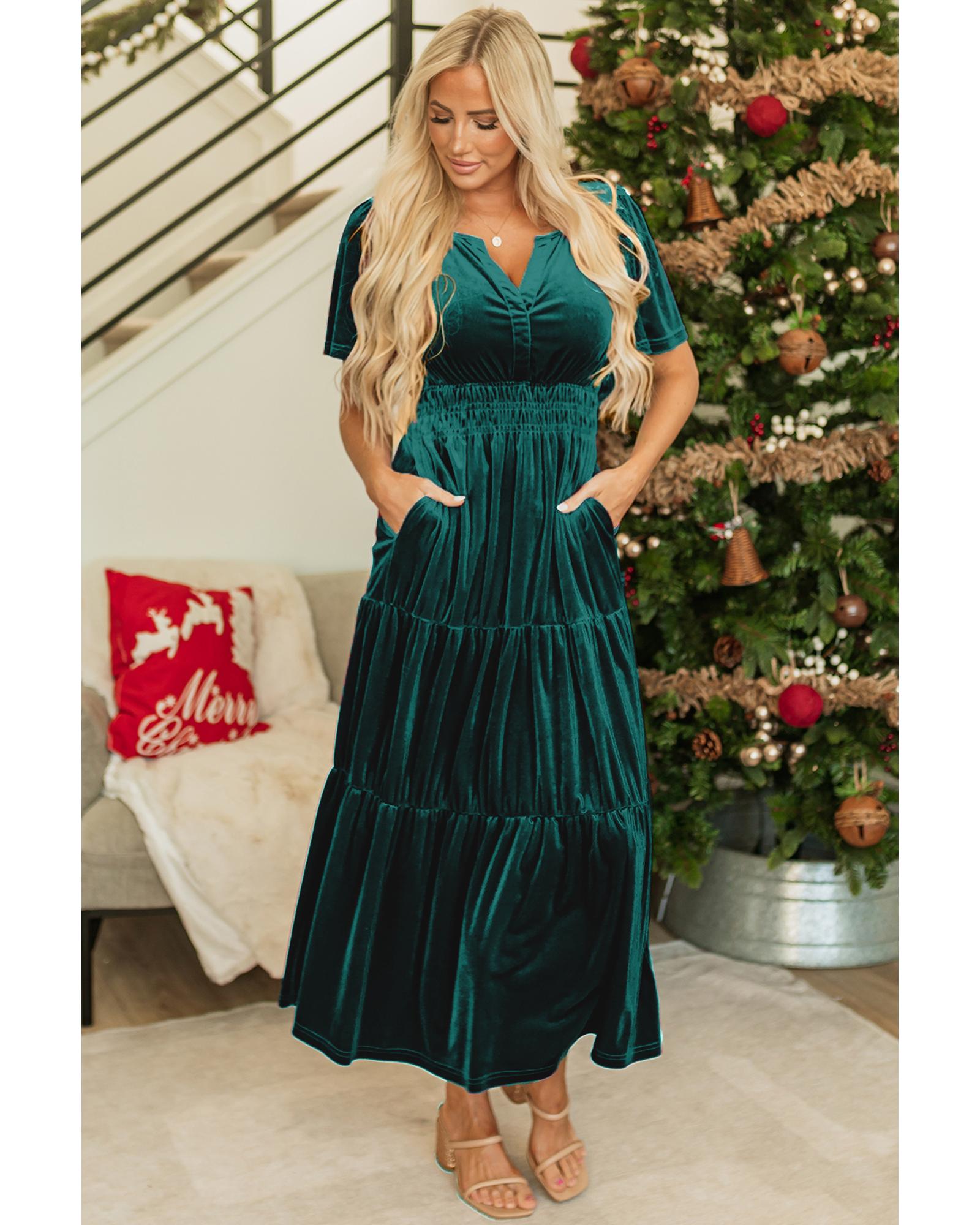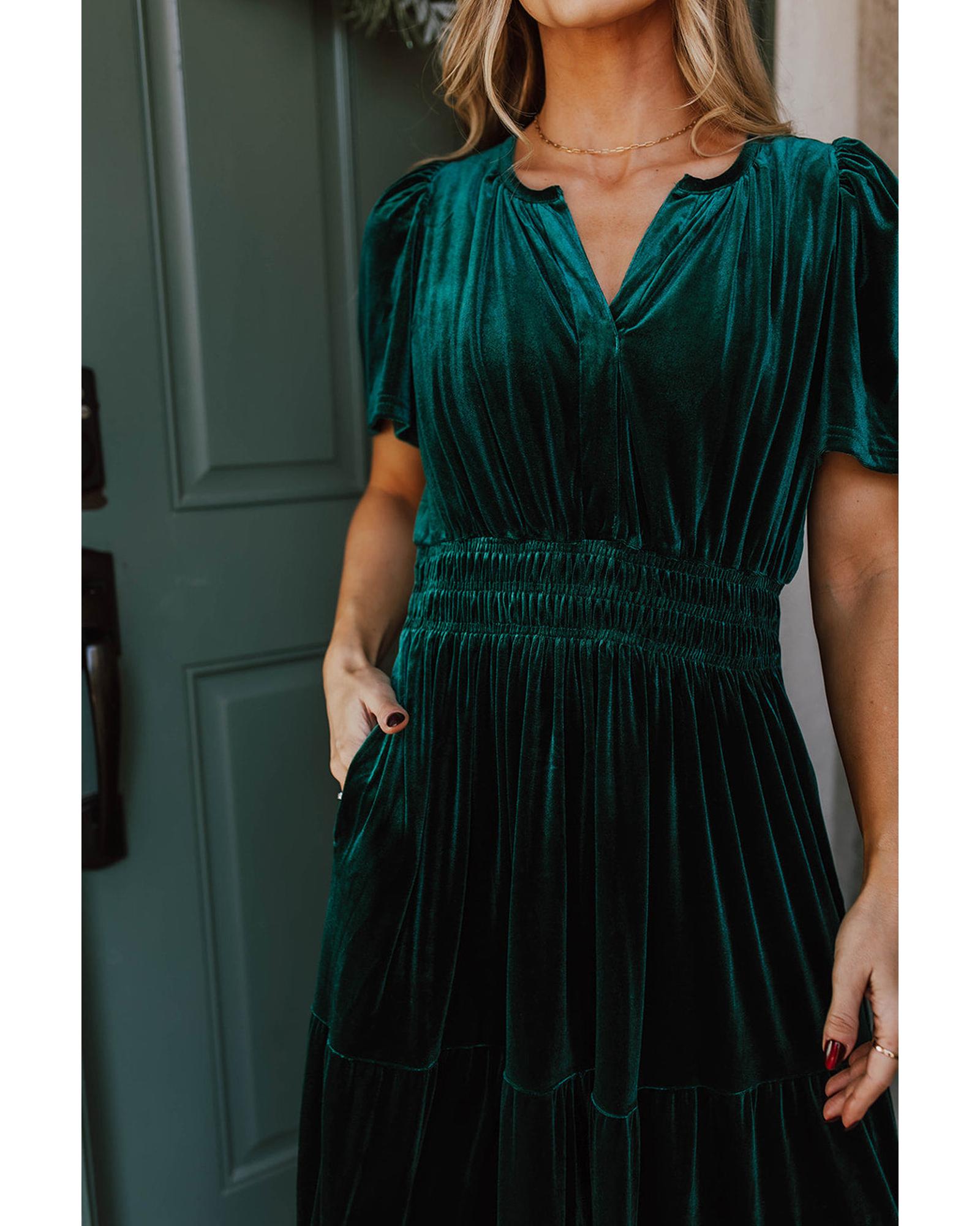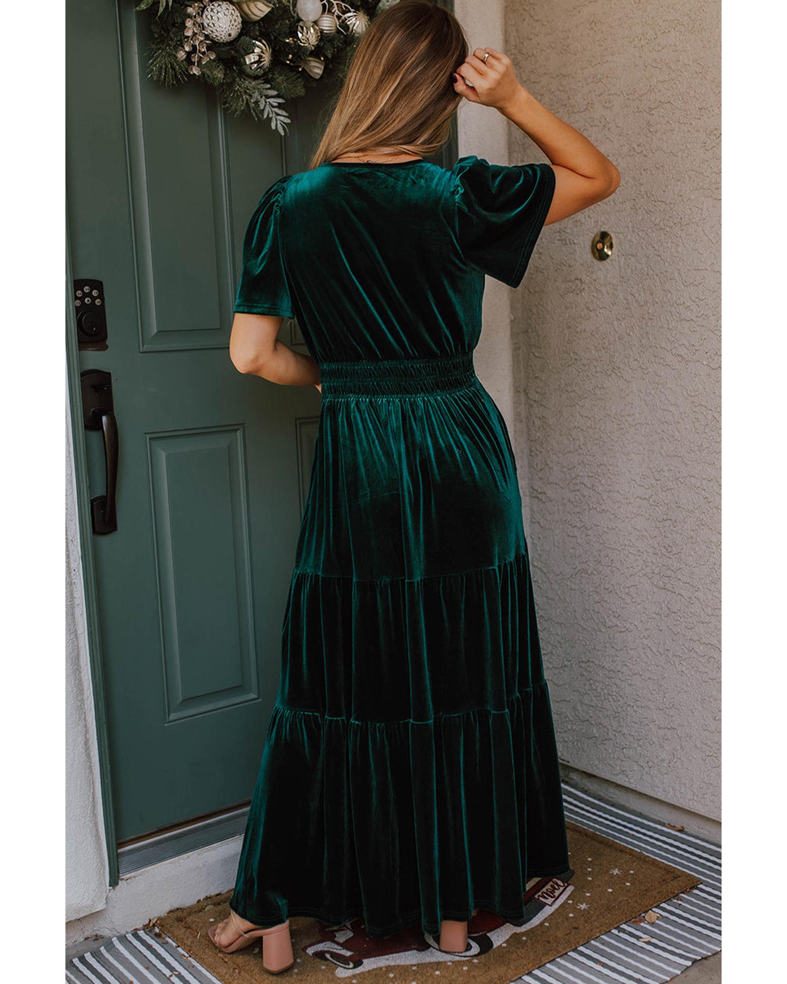 Evergreen Velvet Short Sleeve Shirred Waist Tiered Maxi Dress – M