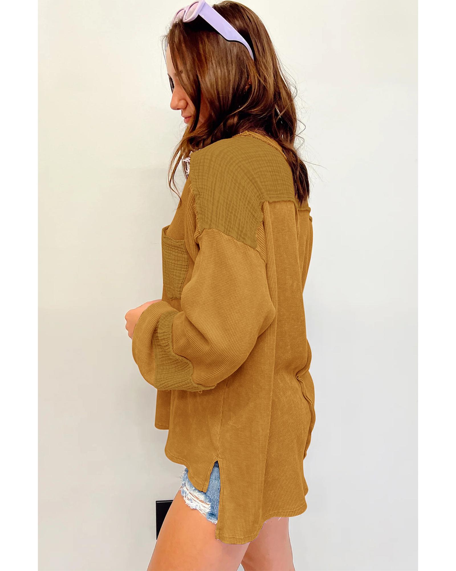 Exposed Seam Patchwork Bubble Sleeve Waffle Knit Top – 2XL
