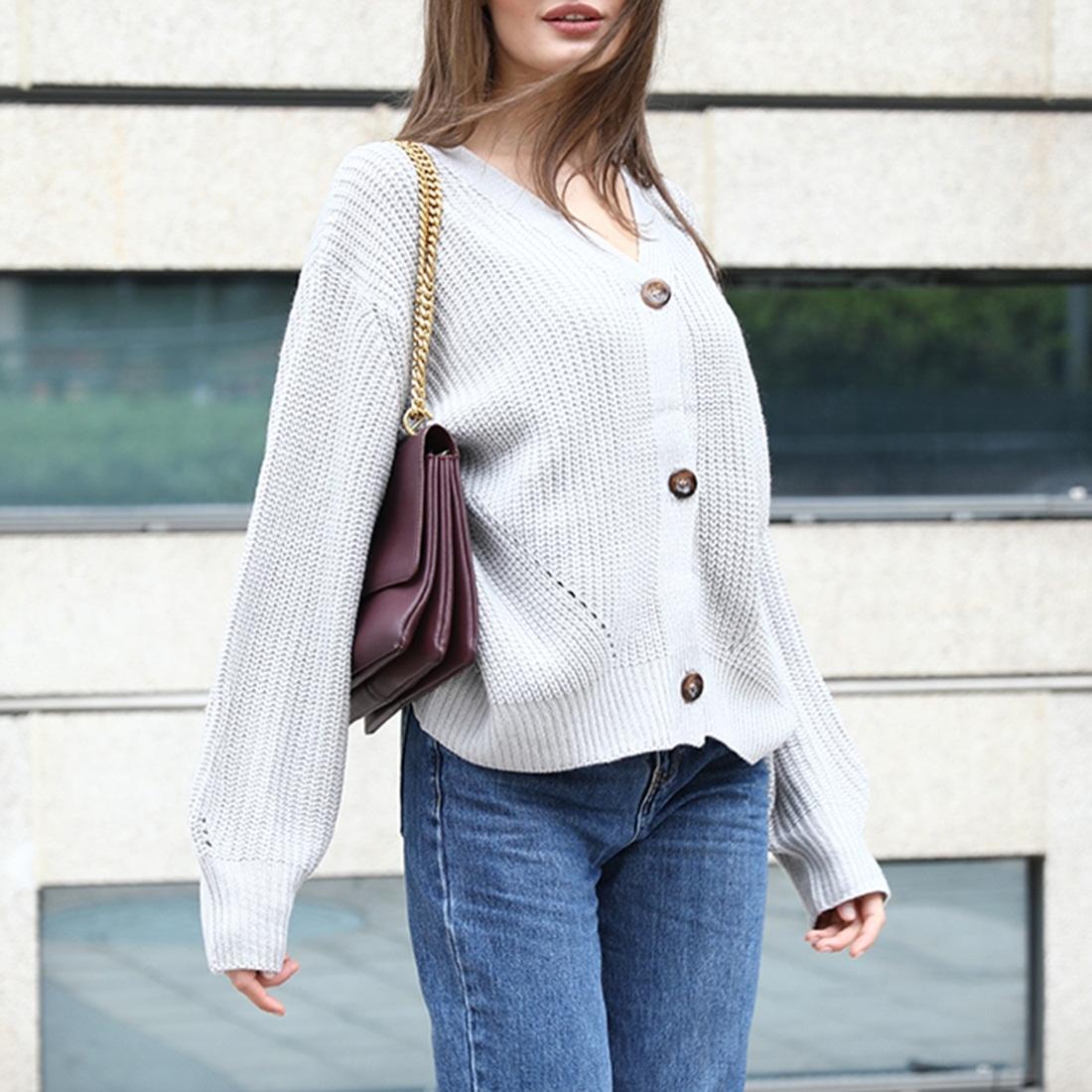 Fashion Cardigan Solid Colour Knit Button Sweater Black – Grey M