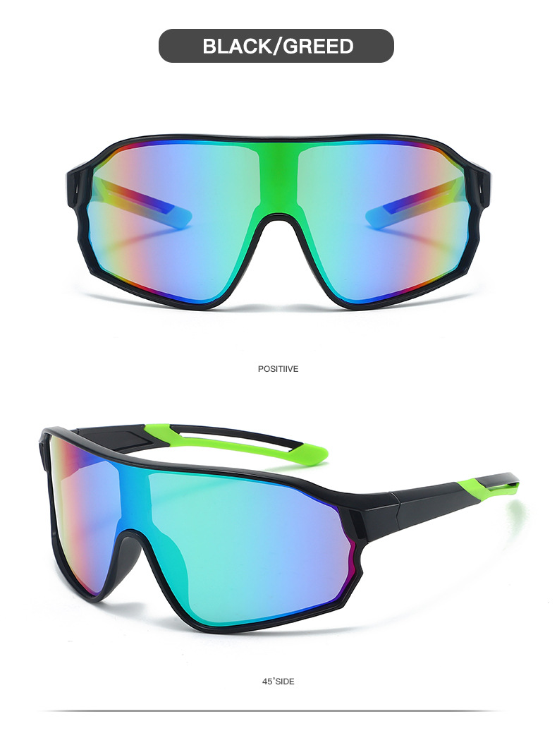 These fashionable sports sunglasses feature colorful mirror lenses and provide UV400 protection, making them suitable for cycling, running, and outdoor activities. The lightweight and ergonomic frame offers a comfortable fit for extended wear, while the wide lens design enhances peripheral vision.