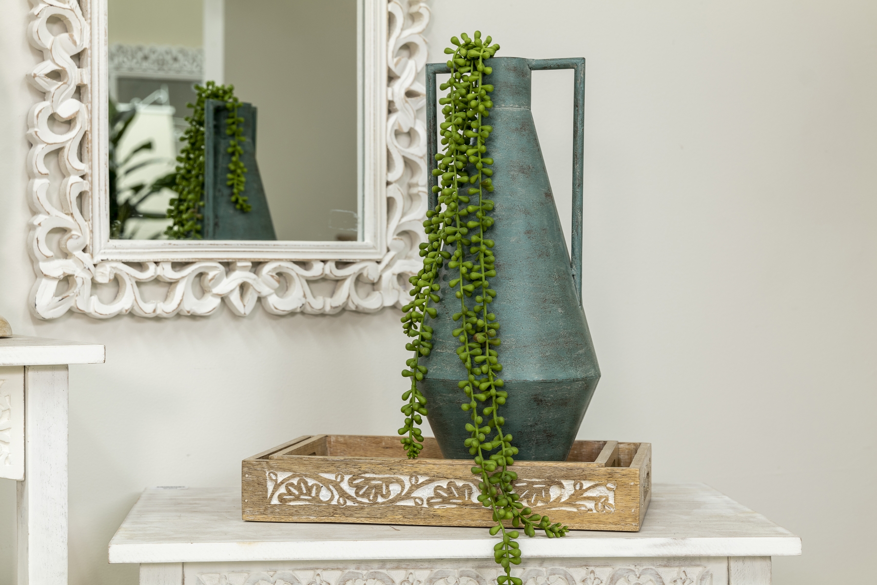 This faux long string of pearls measures 74 centimeters in length and features realistic foliage, making it an attractive decorative piece for any room. Its natural appearance adds a touch of elegance and greenery to your space, suitable for various interior styles.
