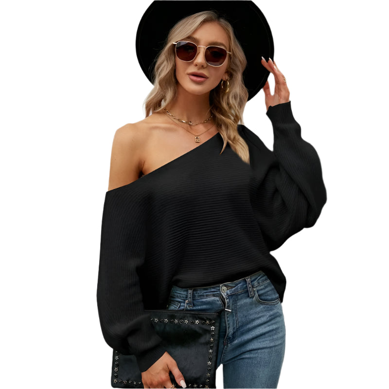 This female strapless knit shirt features a loose fit with bat sleeves, offering a stylish and comfortable look. Made from high-quality fabric, it combines softness and durability, making it suitable for various occasions. The pullover design with a slant collar adds a unique touch to the overall style.