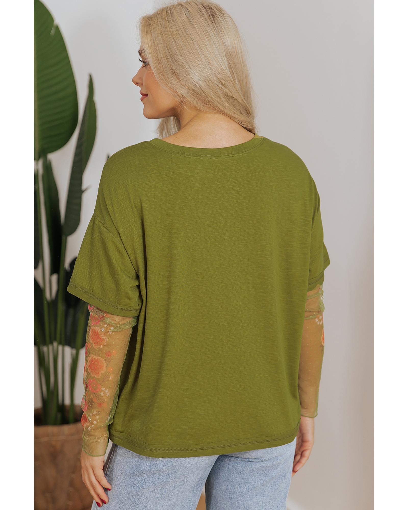 This Fern Green Faux Two Piece Floral Long Sleeve Patchwork Tee offers a trendy and comfortable style suitable for various casual occasions. Designed with a relaxed fit, it features floral mesh sleeves and a faux under shirt, making it a versatile addition to your wardrobe. The top pairs well with jeans or casual pants and is ideal for transitional seasons.
