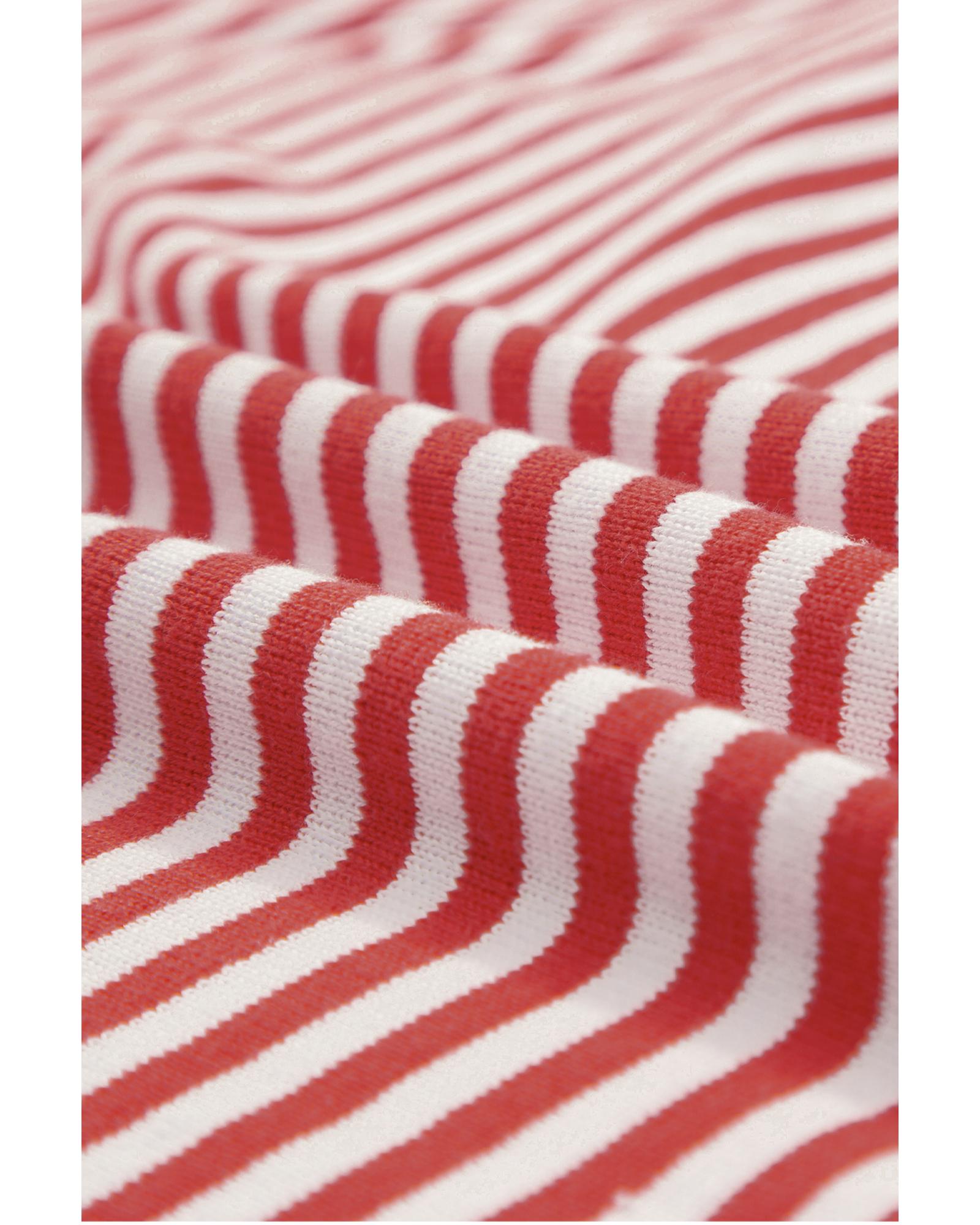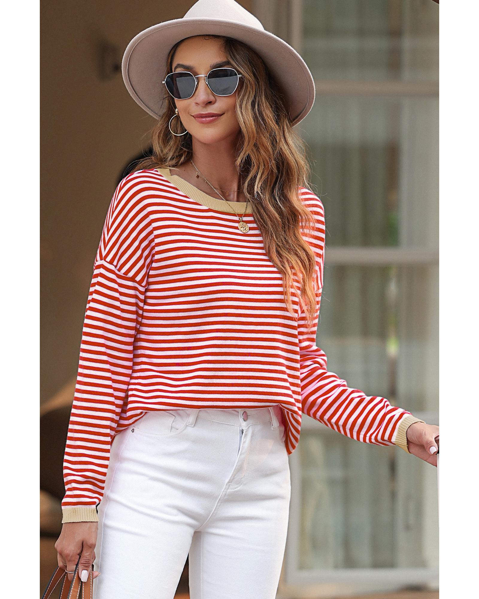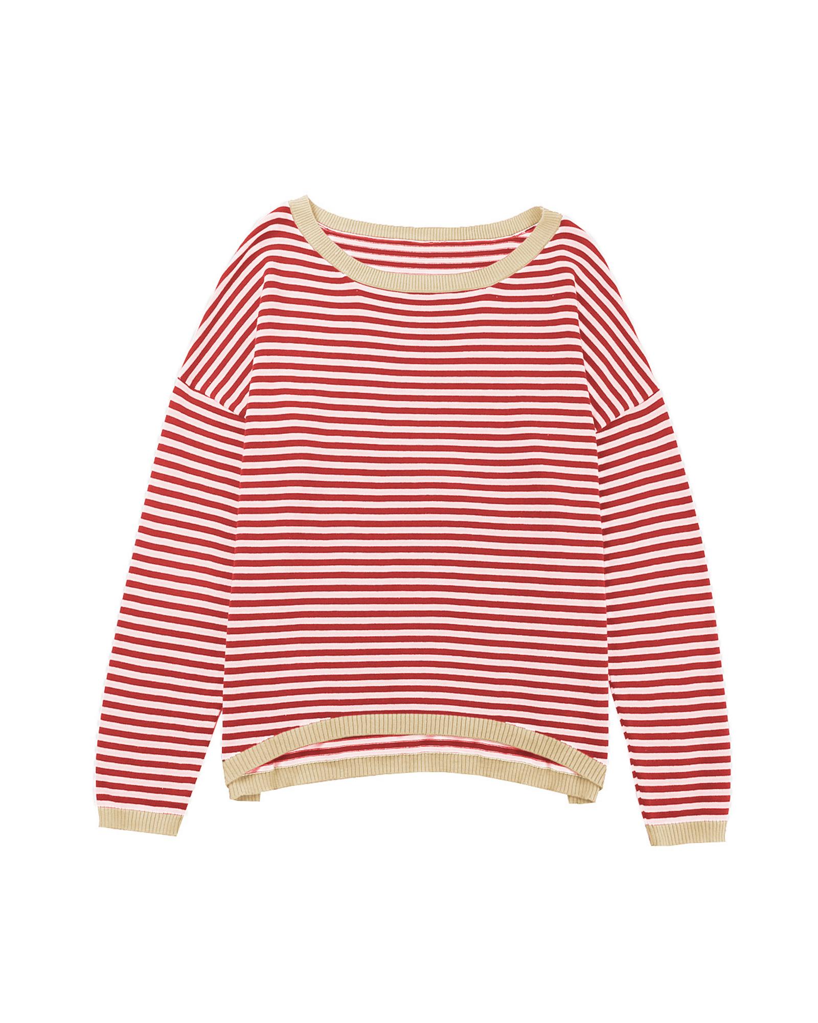 This sweater features a vibrant red color with contrasting trim and a classic striped pattern, offering a stylish and timeless look. Its drop shoulder design provides a relaxed and chic fit, making it suitable for various casual occasions.
