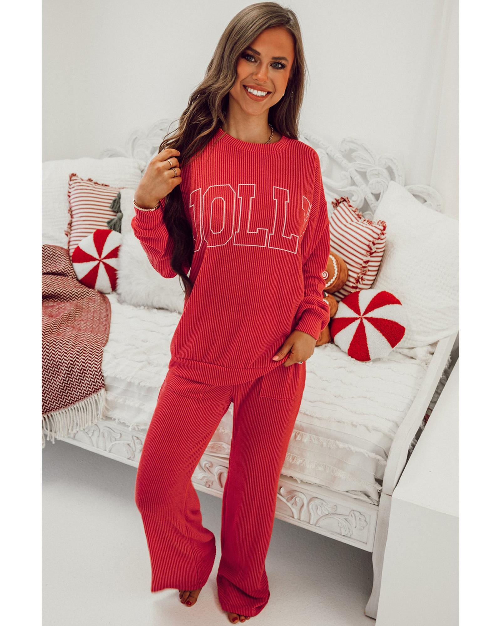 This long sleeve top and pants set features a vibrant fiery red color with a stylish JOLLY pattern, offering a trendy and comfortable look suitable for daily errands or lounging at home. The set includes a fitted long sleeve top and matching pants, crafted from soft ribbed knit material for maximum comfort and a sophisticated appearance.