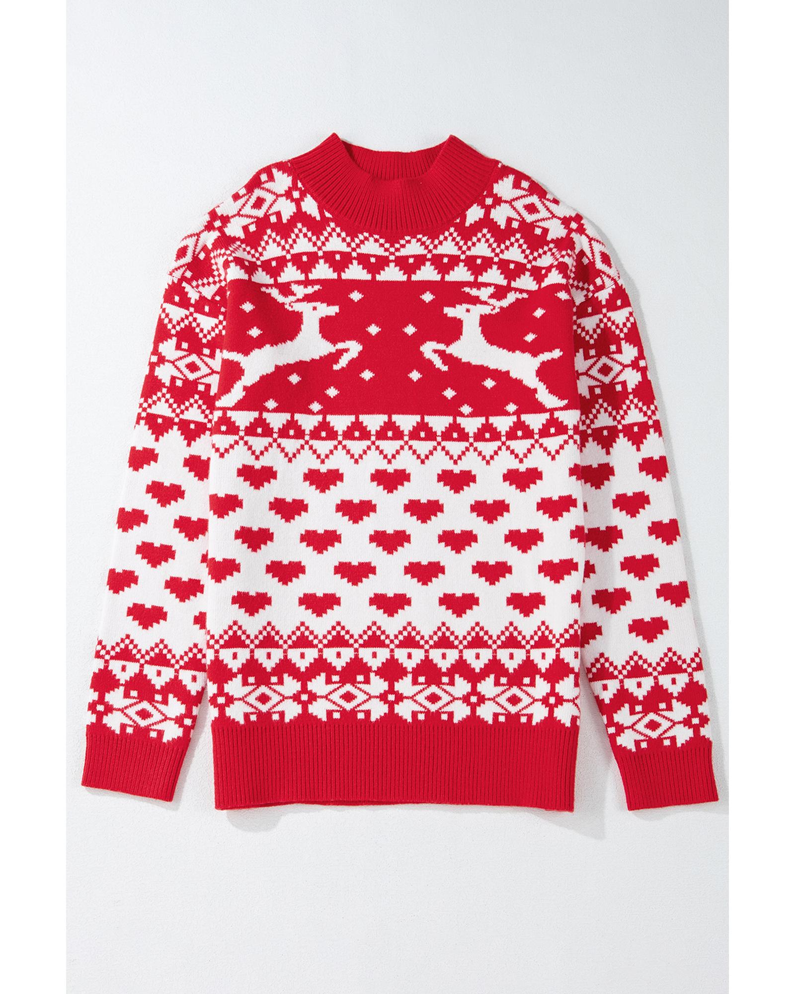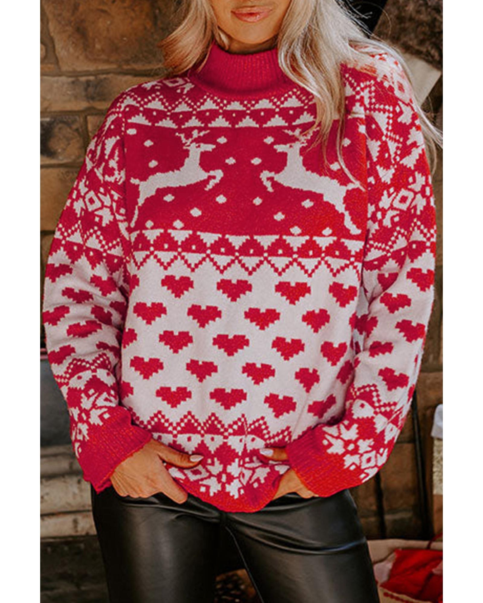 This festive high neck sweater features a vibrant red color with a cheerful reindeer and heart pattern, making it an ideal choice for holiday celebrations. Designed with a trendy fitted silhouette, it offers both style and comfort for various casual occasions during the Christmas season.