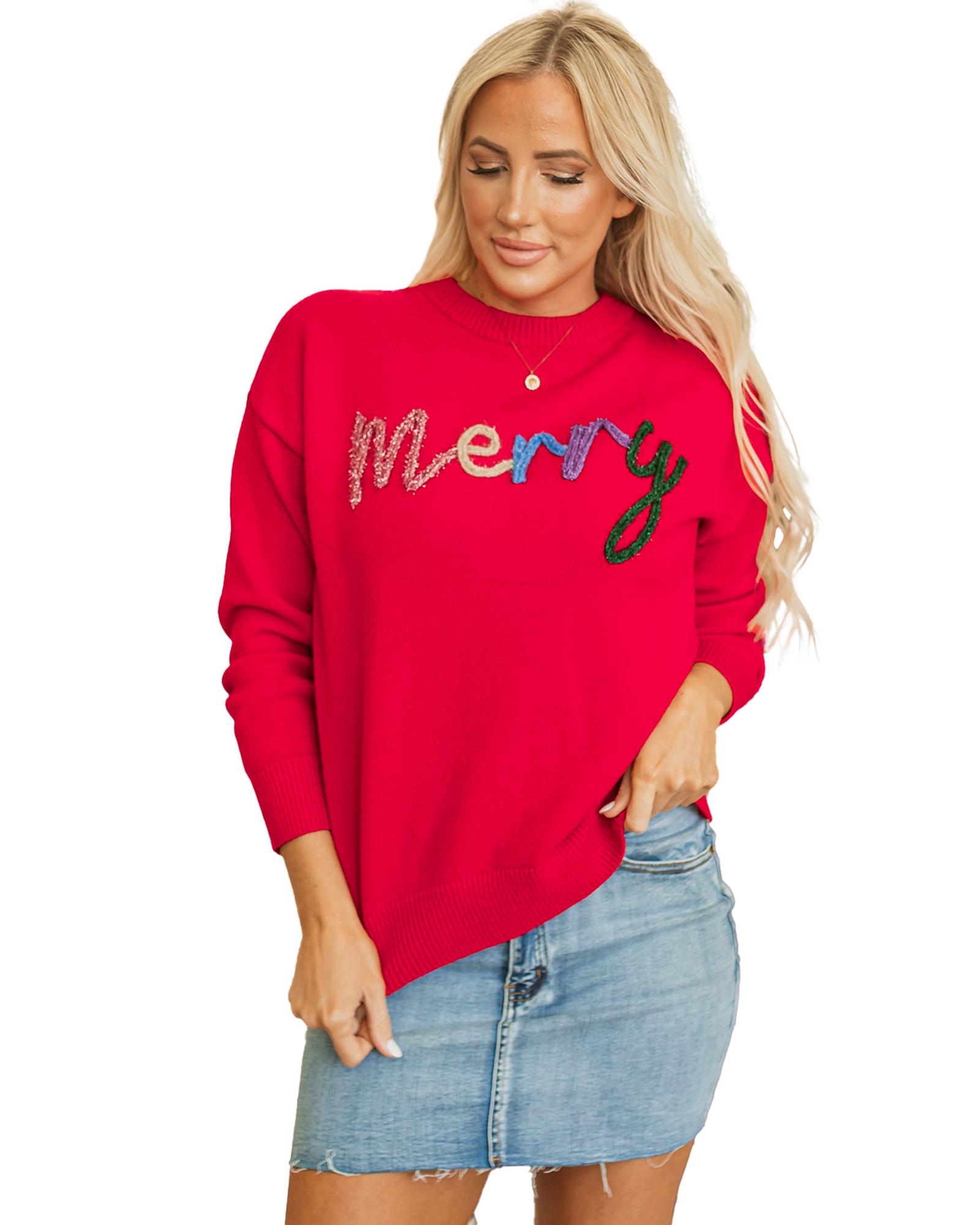 Fiery Red Tinsel Merry Letter Drop Shoulder Baggy Sweater – S