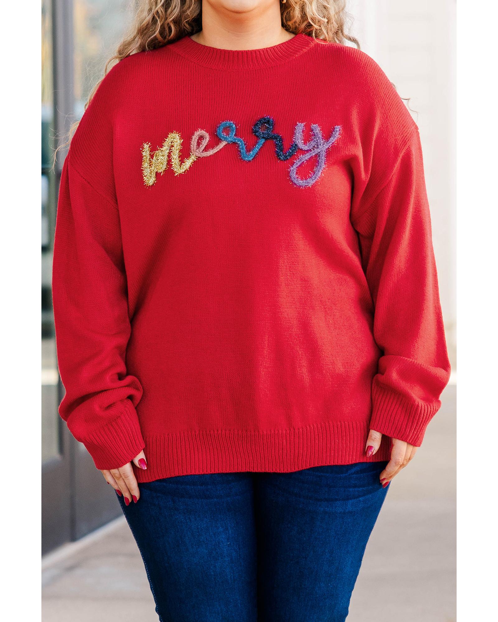 This plus size sweater features a vibrant fiery red tinsel merry pattern, designed with a trendy fitted look. It offers a comfortable fit with high elasticity and a classic crew neck, making it suitable for festive occasions and casual wear.