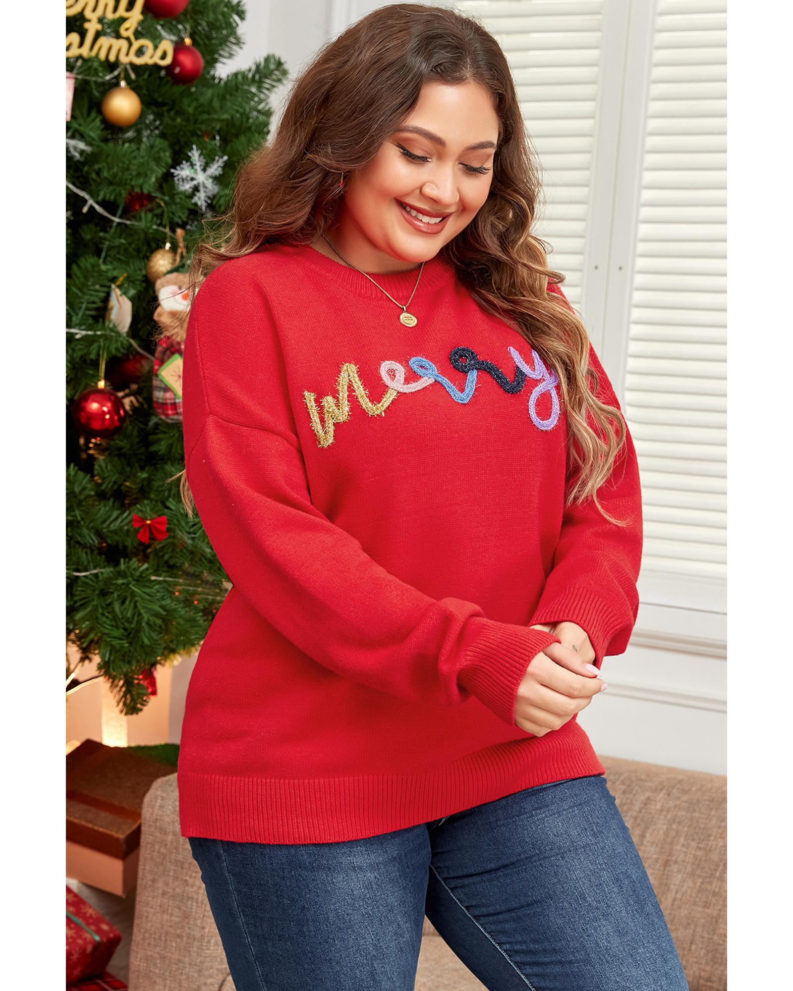 This plus size sweater features a vibrant fiery red tinsel merry pattern, designed with a trendy fitted look. It offers a comfortable fit with high elasticity and a classic crew neck, making it suitable for various occasions.