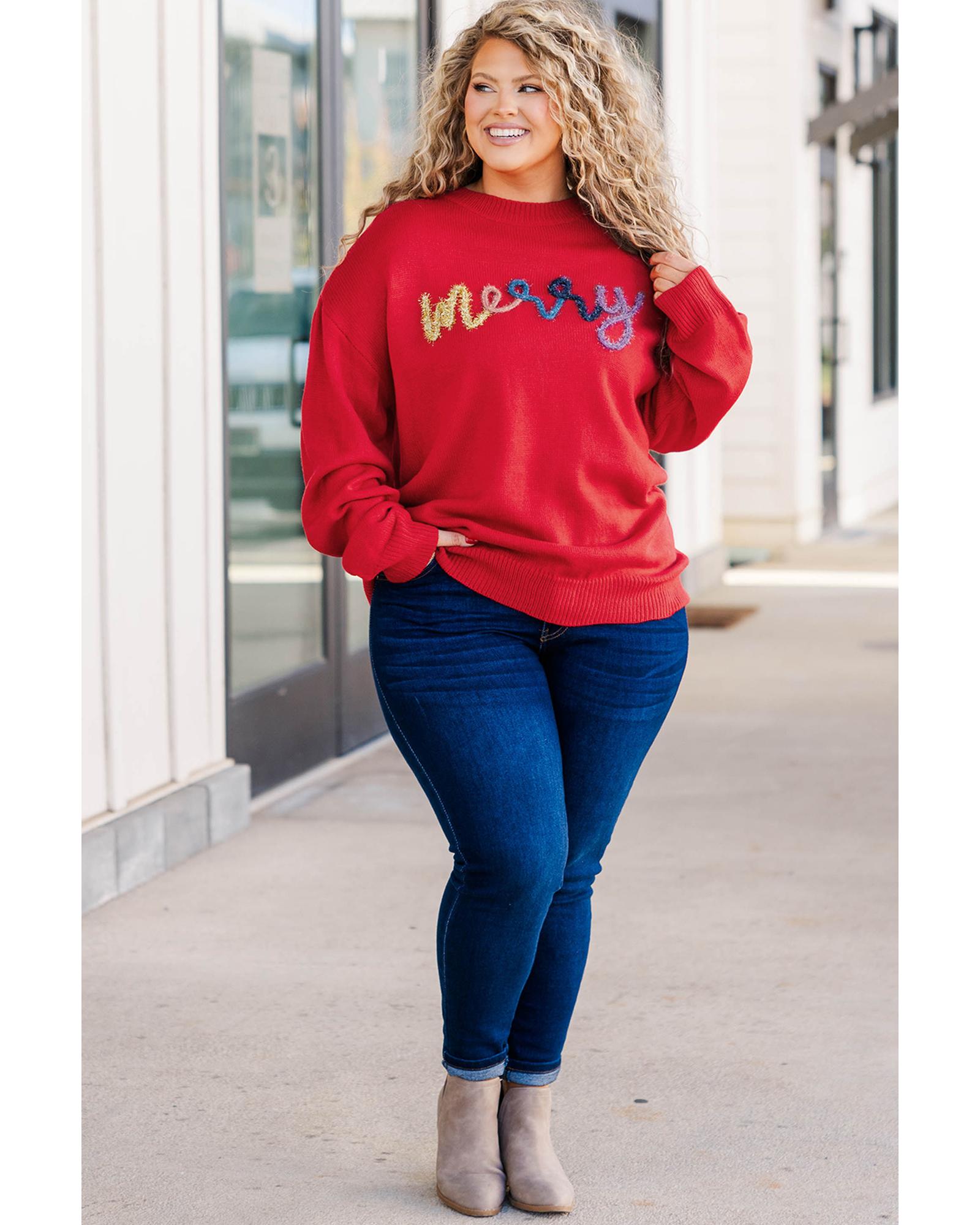 This plus size sweater features a vibrant fiery red tinsel merry pattern, designed with a trendy fitted look. It offers a comfortable fit with high elasticity and a classic crew neck, making it suitable for various occasions. The drop shoulder design adds a relaxed and stylish touch, perfect for those seeking both comfort and fashion.