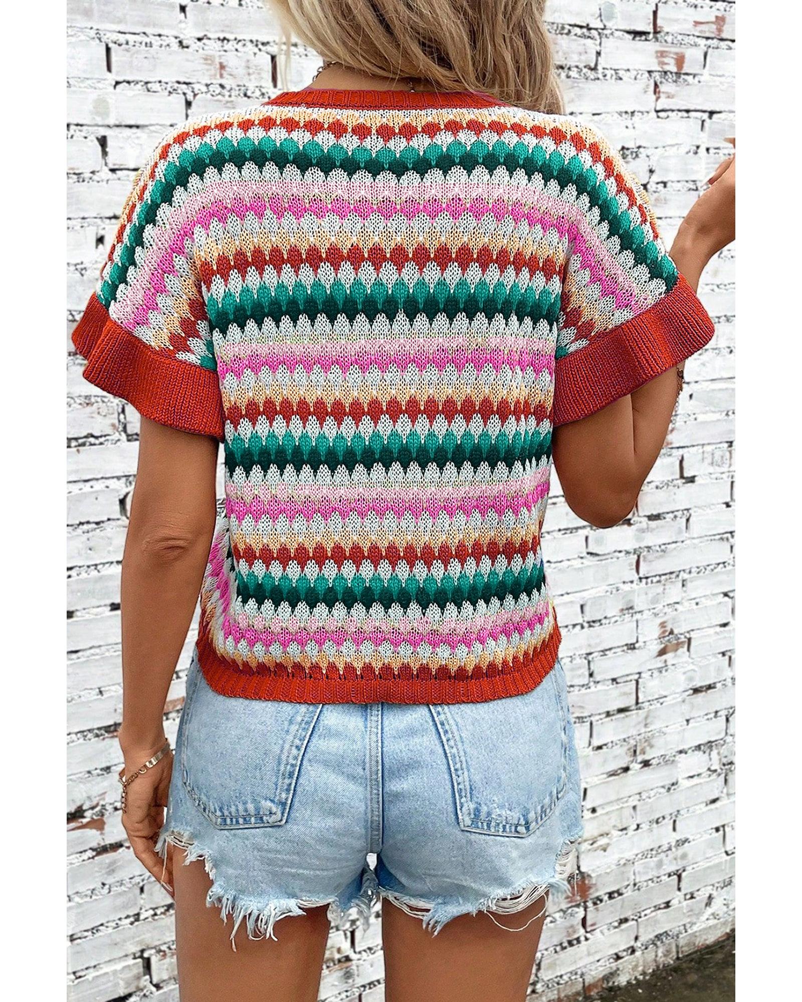 This colorful textured sweater features a vibrant multicolor pattern and feminine ruffle sleeves, making it a stylish addition to your wardrobe. Designed with a trendy fitted silhouette, it combines comfort and fashion, perfect for colder seasons.