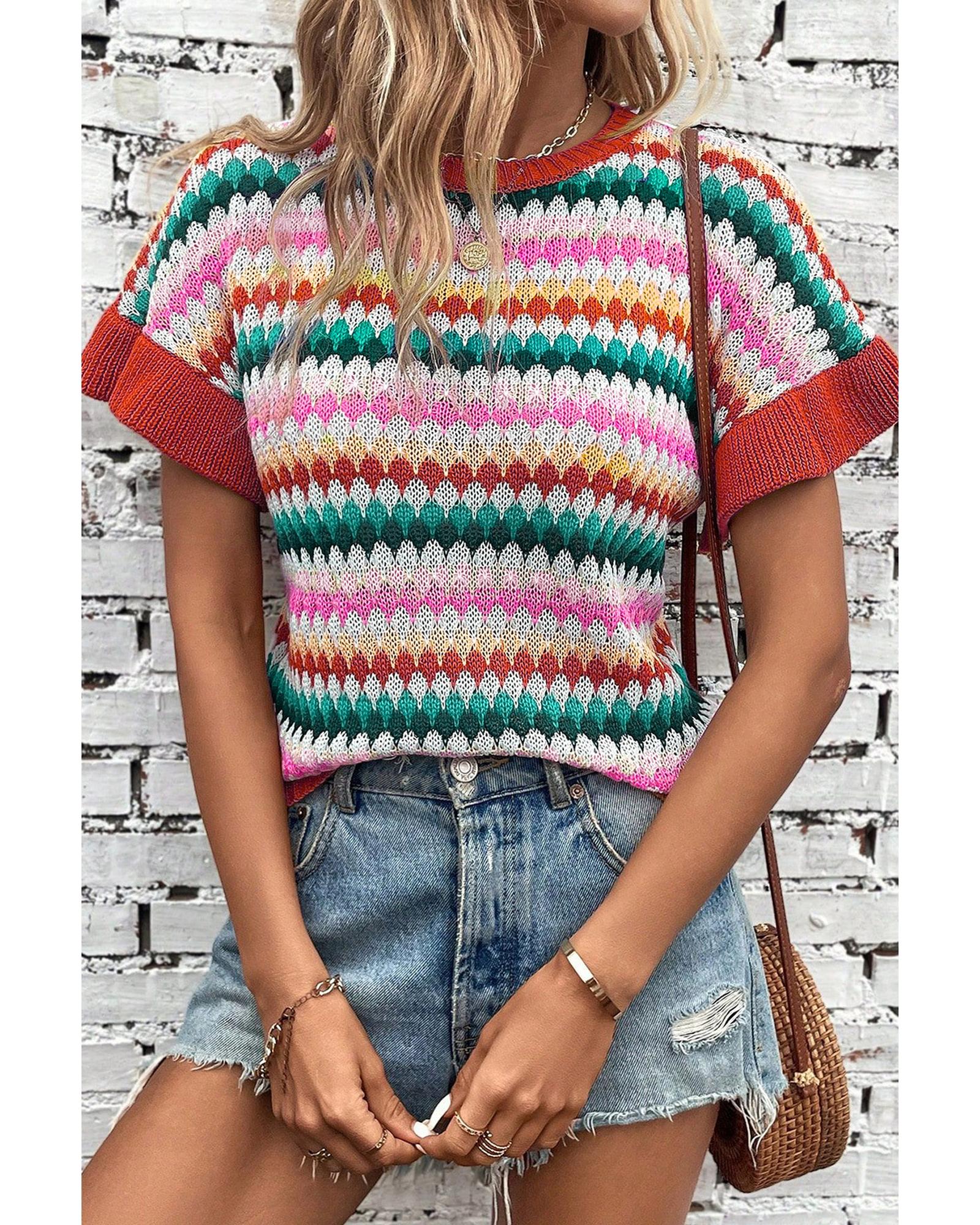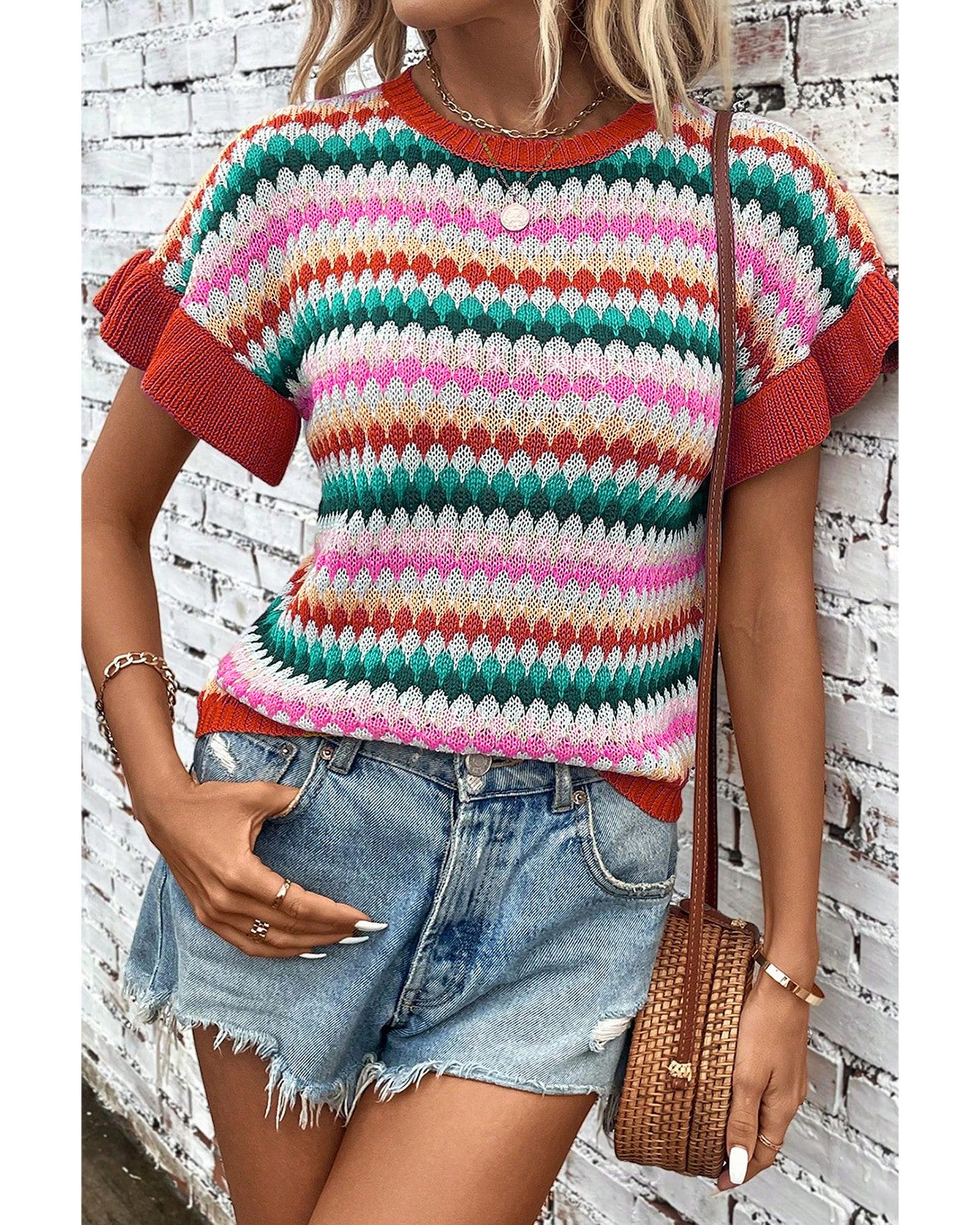 This colorful textured sweater features a vibrant multicolor pattern and a stylish design with trimmed ruffle sleeves. Its knitted texture offers warmth and comfort, making it an ideal choice for colder seasons. The sweater combines a timeless crew neck with fashionable details, creating a trendy fitted look.