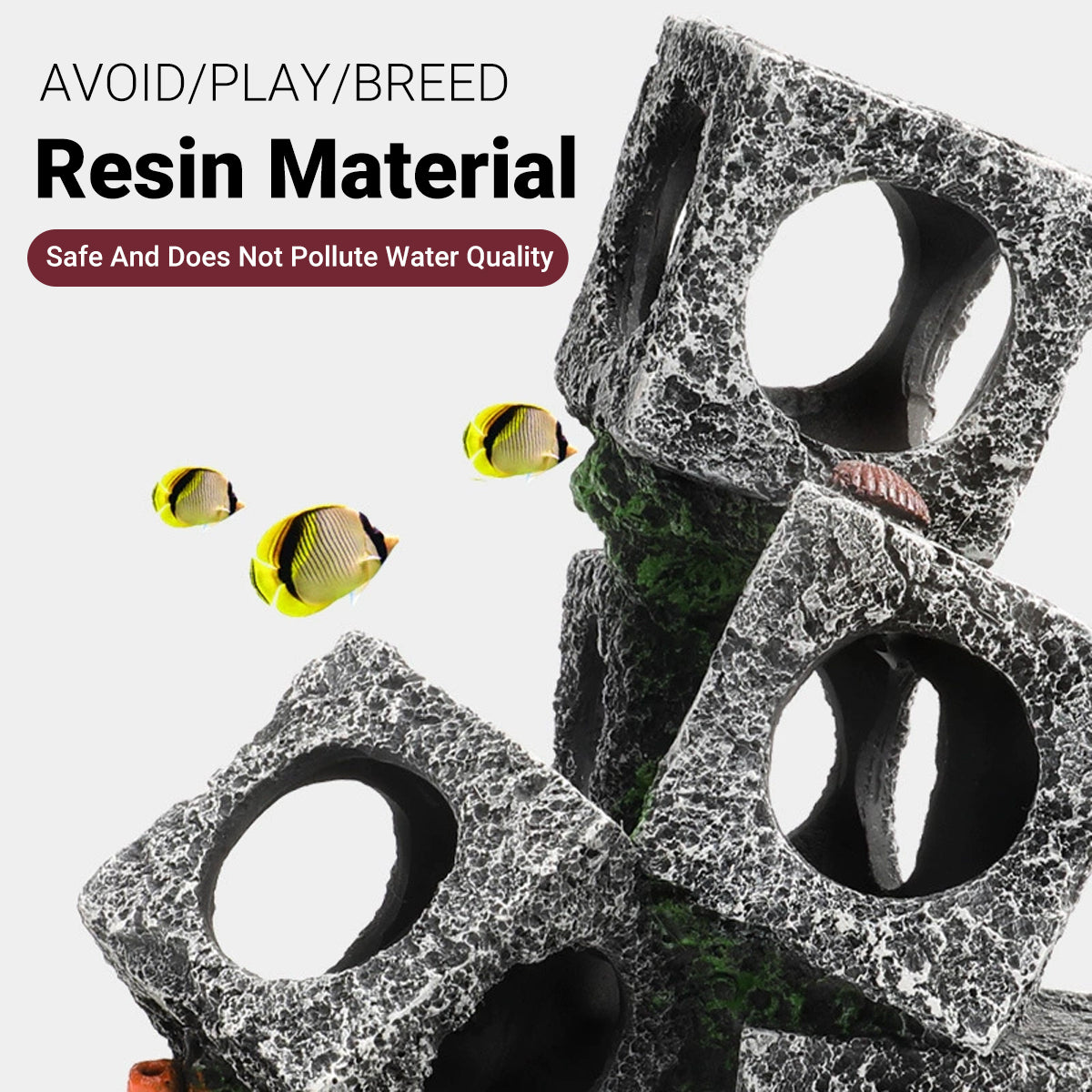 This square stone-style resin shelter provides a natural-looking hiding and breeding environment for small aquatic creatures. Available in multiple configurations, it is designed to enhance the aesthetic appeal and functionality of both freshwater and saltwater aquariums by offering a safe space for fish, shrimp, and other small species. Its open circular design promotes movement and reduces stress, supporting a healthy aquatic ecosystem.