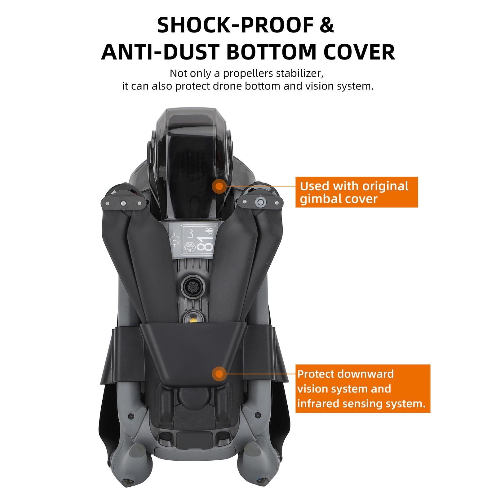 This product is a fixed propeller guard designed for the drone model. It features a foldable storage design that securely holds the blades inside the fuselage, providing safe and convenient storage. The guard is constructed with a hard frame that fits the drone’s fuselage and soft silicone wraps around the propellers to prevent damage without applying pressure. An anti-knock and dust-proof bottom cover offers additional protection for the drone’s downward vision and infrared sensing systems. It allows for easy transportation and storage without disassembling the propellers, fitting into various compatible carrying cases and safety boxes.