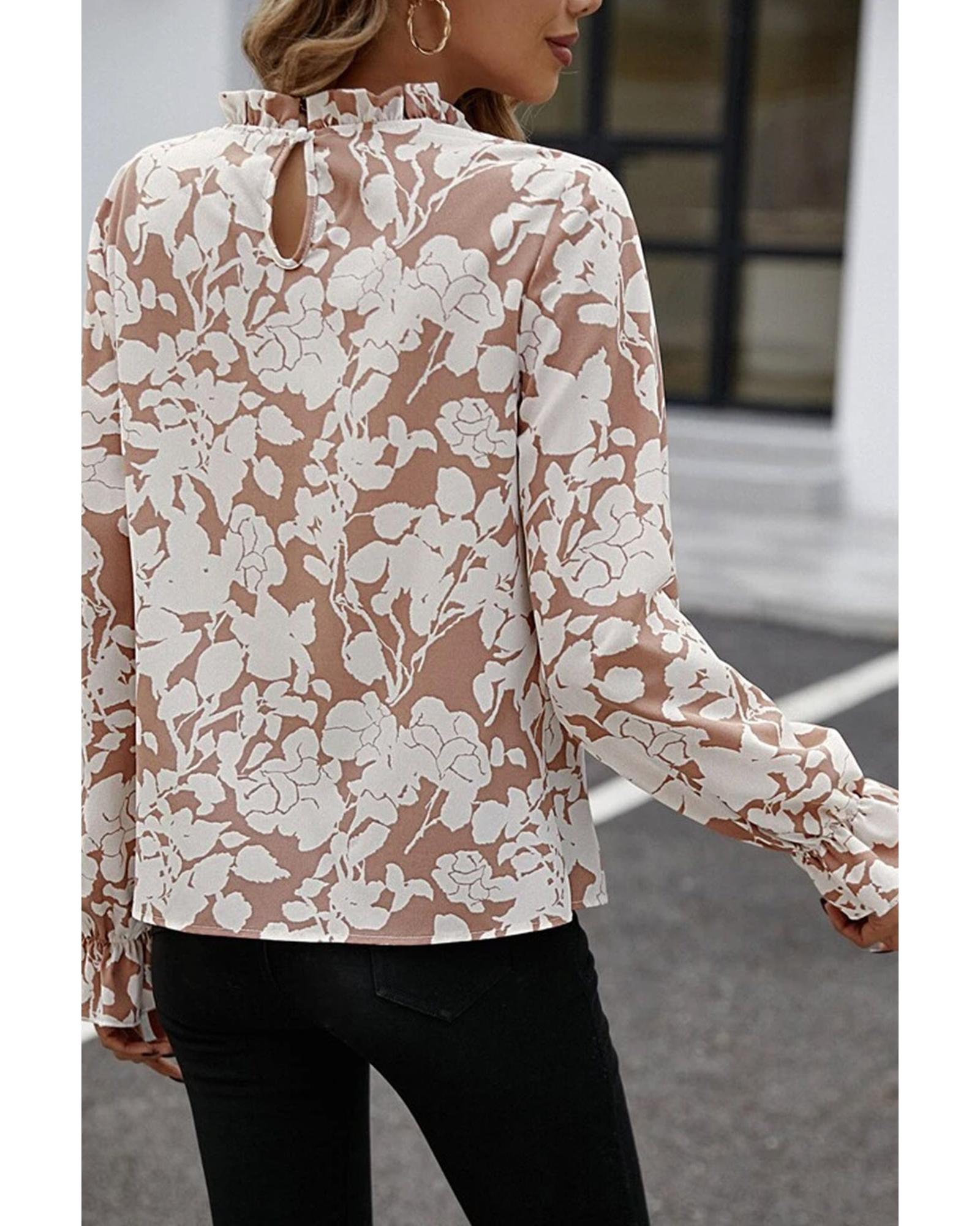 This floral print blouse features a stylish design with a frilled neckline and flounce sleeves, making it suitable for various occasions. Its versatile style allows for easy pairing with different outfits, providing a trendy and comfortable look.