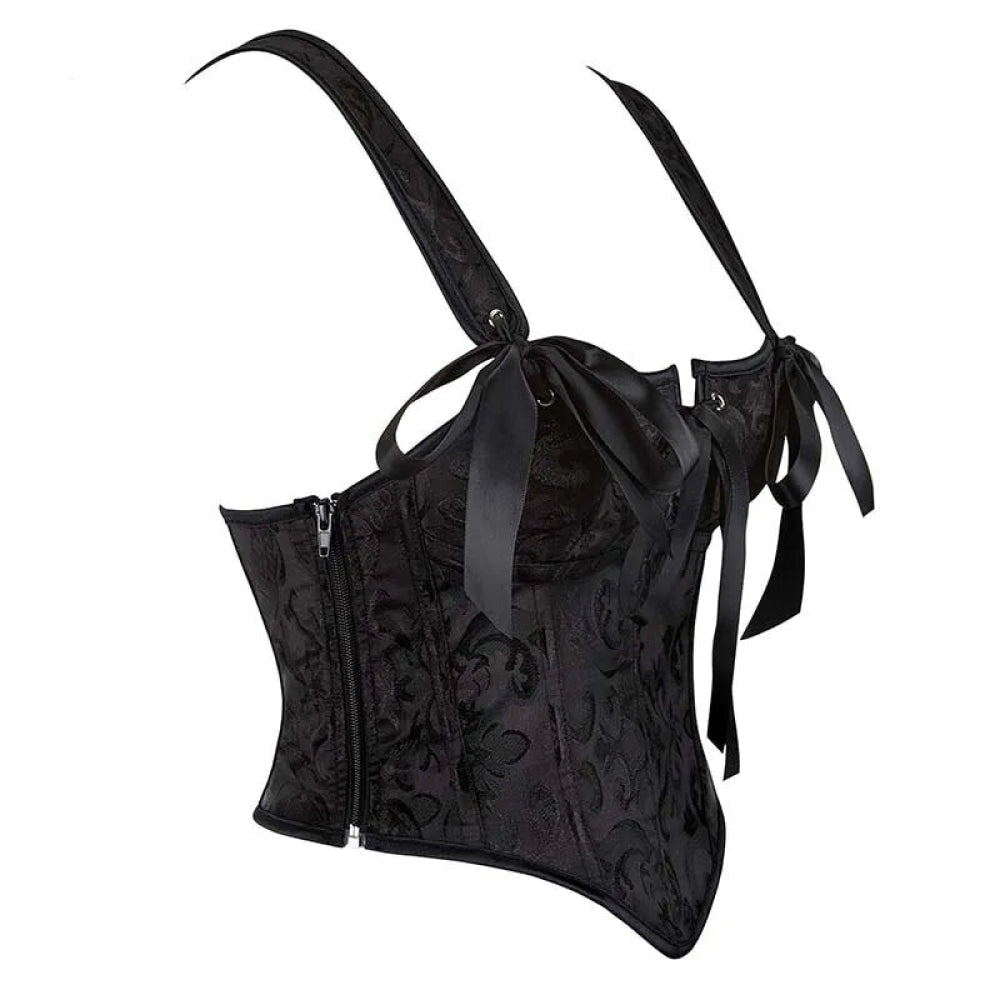 This floral lace-up gothic crop top is a sleeveless, boned corset with strap design, suitable for various occasions including parties, dancing, and everyday wear. It features a stylish gothic print pattern and is designed to provide support and comfort with elastic bones and a side zipper for easy dressing.