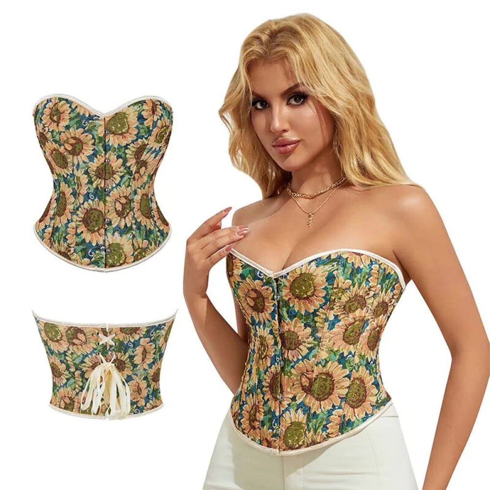 This floral sunflower lace bustier is designed in a plus size range from XS to XXL, featuring a front busk and lace-up detail. It combines a stylish print pattern with a seamless, strapless design, making it suitable for various occasions including parties, dates, and everyday wear.