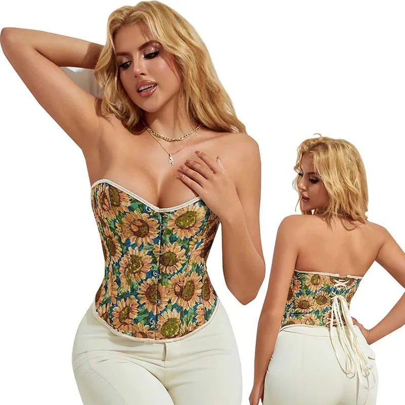 This floral sunflower lace bustier is designed in a plus size range from XS to XXL, featuring a front busk and lace-up detail. It combines a stylish print pattern with a seamless, strapless design, making it suitable for various occasions including parties, dates, and everyday wear.