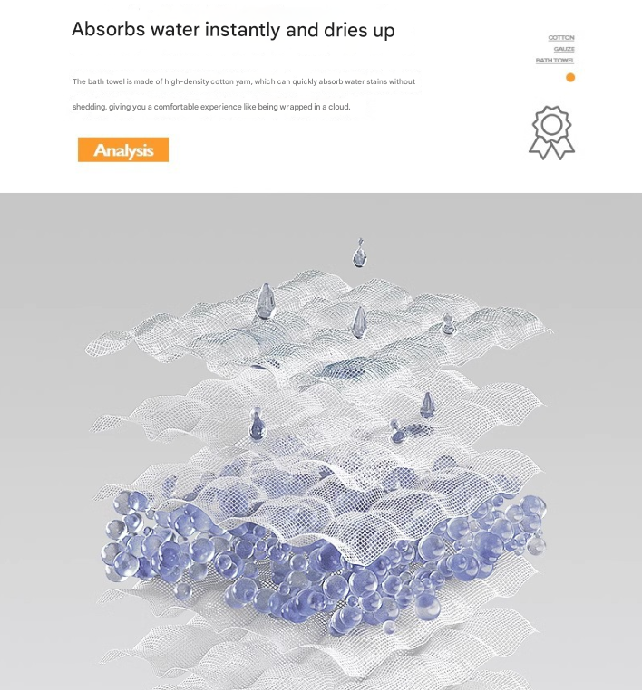 This bath towel is made from high-quality 100% cotton gauze, offering a soft, thick, and highly absorbent surface. Its extra-large size provides a luxurious drying experience, suitable for both men and women. The towel features natural antibacterial properties and durable stitching for long-lasting use.