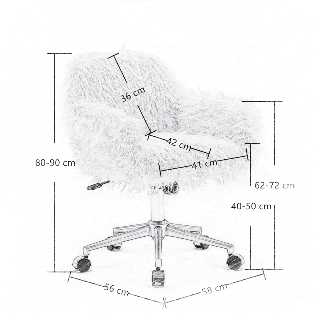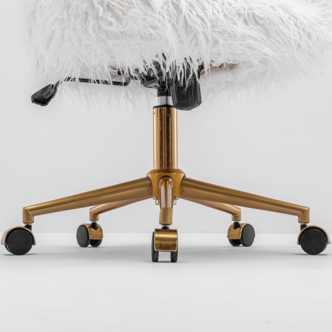 The fluffy office chair features a modern design with a luxurious faux fur covering, adding a stylish and inviting touch to any space. It is built with a sturdy metal frame, a polished metal base with five casters for easy mobility, and a certificated gas lift for adjustable height. Suitable for various desk heights, this chair combines comfort and elegance for work, makeup, or relaxation.