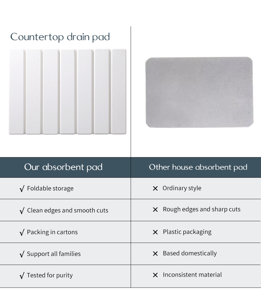 This folding diatomaceous earth countertop drain mat is designed to keep your sink area dry and organized. It features rapid water absorption, quick drying, and a foldable design for easy storage. Made from skin-friendly diatomaceous earth, it offers a durable, non-slip, and easy-to-clean surface suitable for drying dishes, glasses, and kitchen tools.
