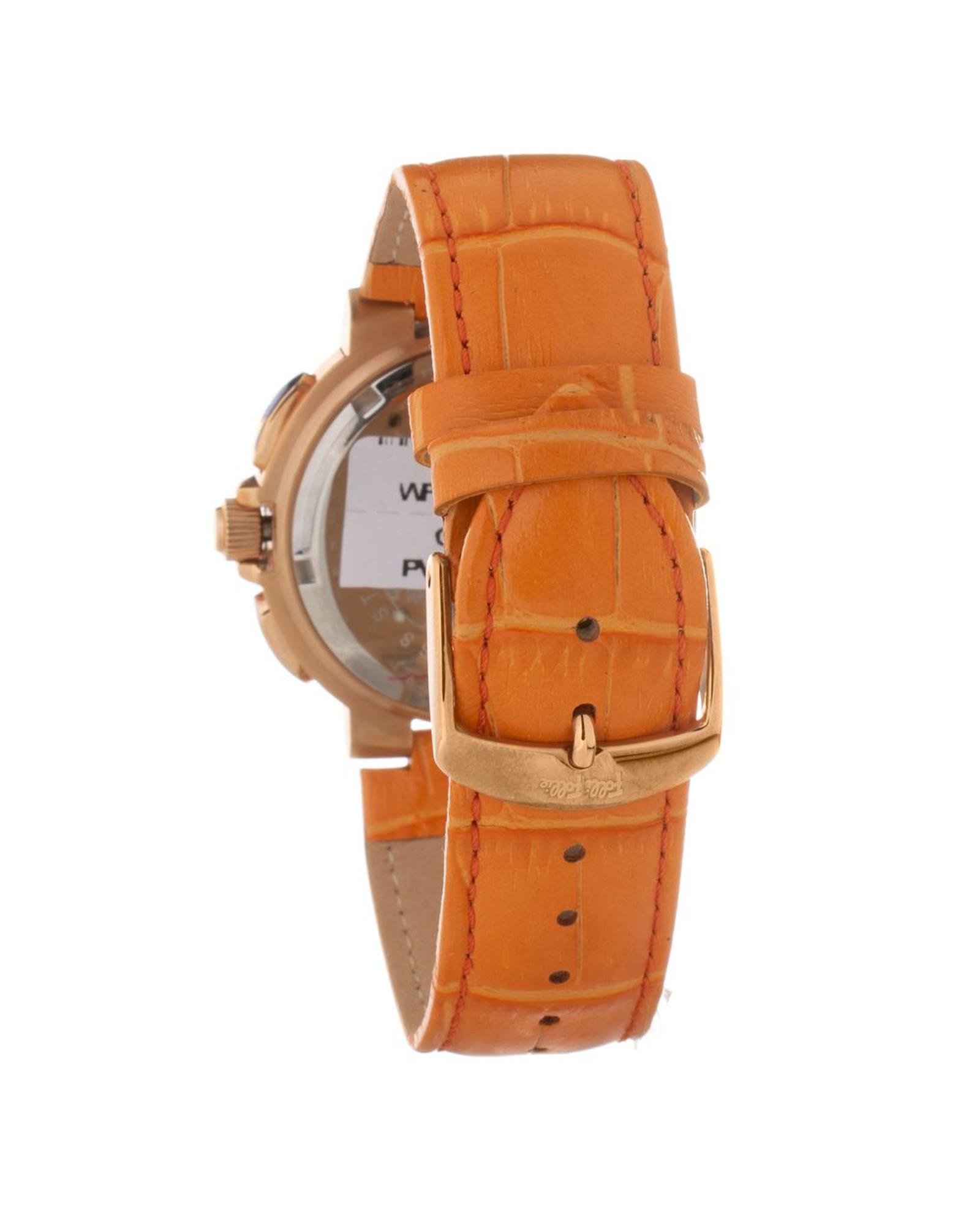 This women’s watch features a stylish orange leather strap and a pink stainless steel case, combining elegance with durability. The watch has an analog display with a white dial and mineral glass for clear visibility. It is powered by a quartz movement, ensuring accurate timekeeping. The closure is a classic buckle, providing a secure fit.