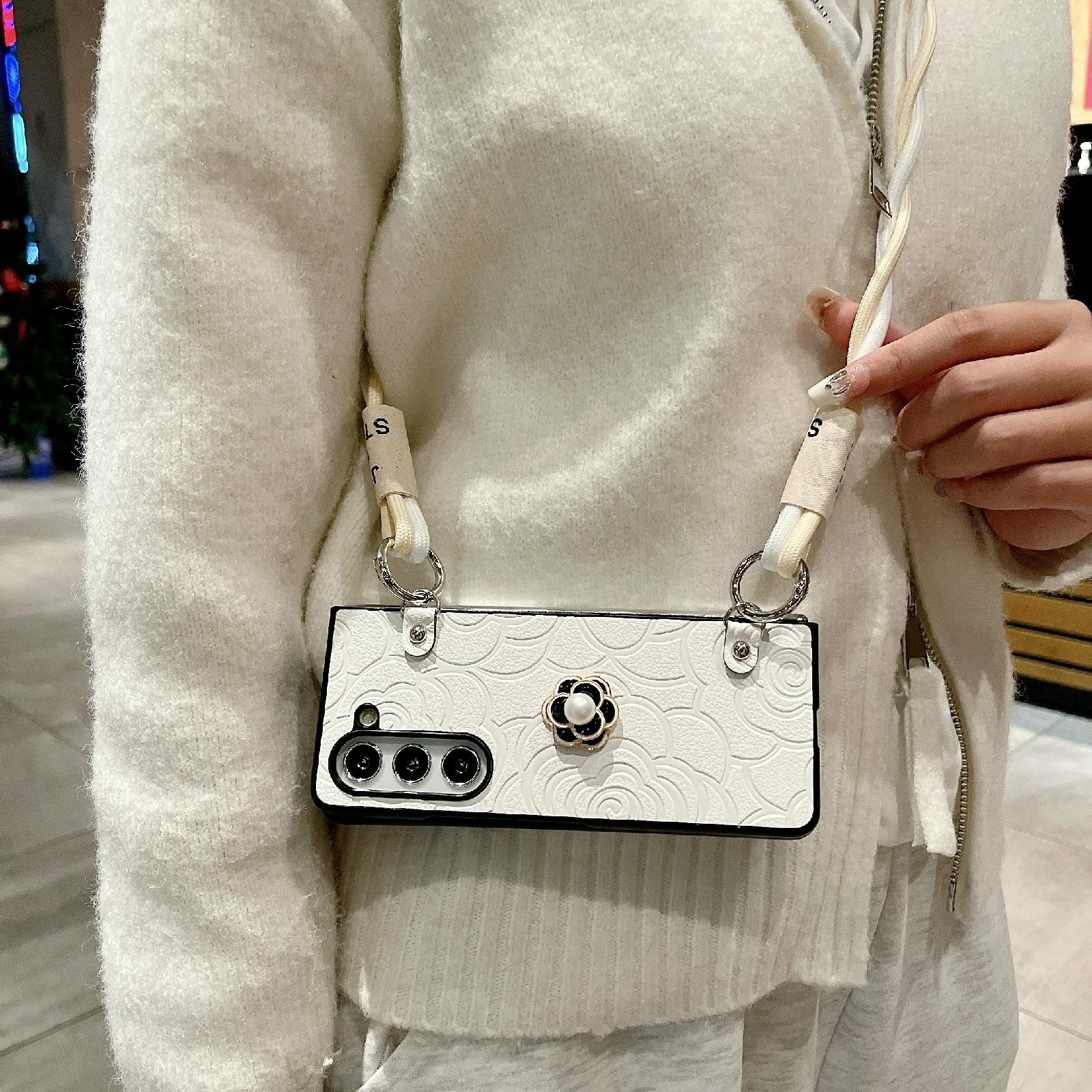 For Samsung Galaxy Z Fold4 5G Camellia Pattern Phone Case With Lanyard – Black
