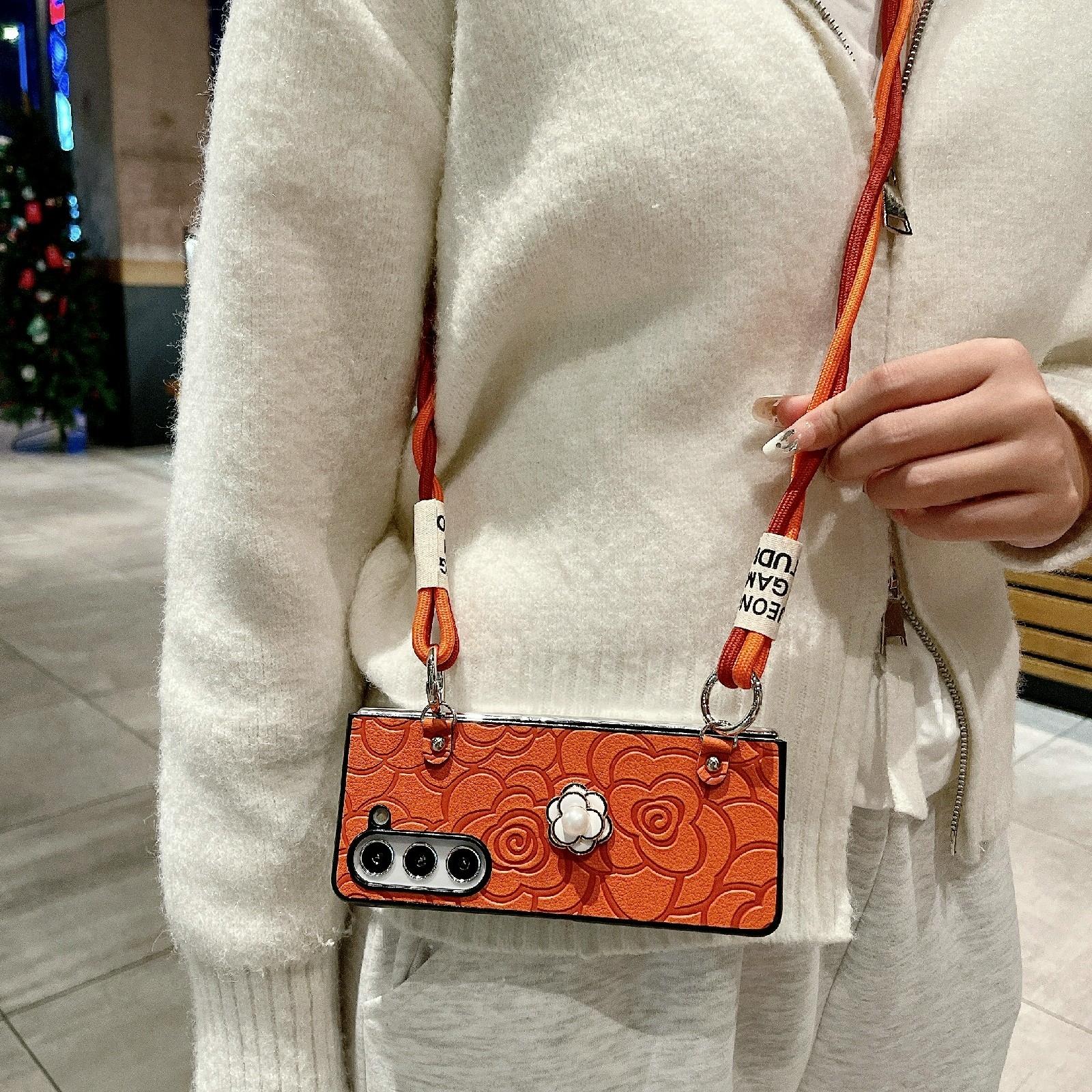 For Samsung Galaxy Z Fold4 5G Camellia Pattern Phone Case With Lanyard – Orange