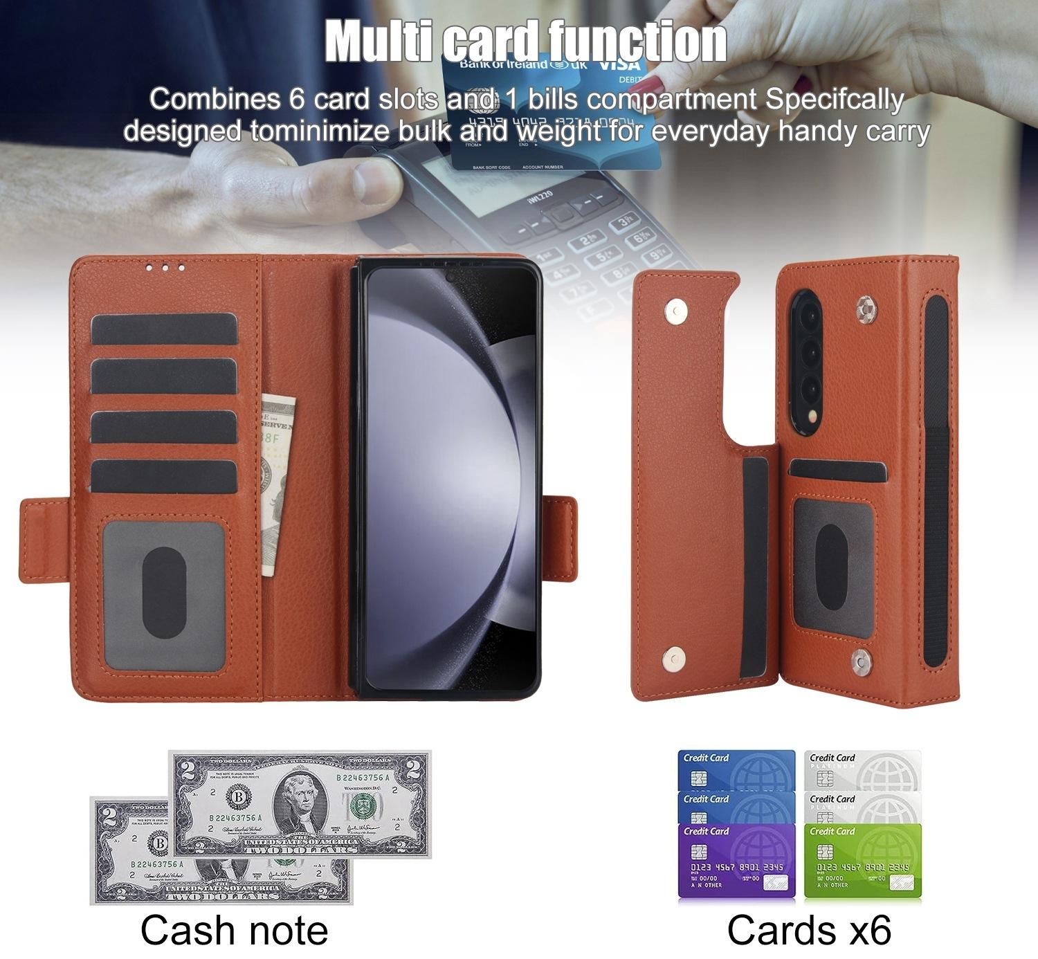 This is a leather phone case designed for the Galaxy Z Fold4 5G. It combines protection with functionality, featuring card slots and an adjustable kickstand for convenient use. The case offers easy access to all buttons and ports, and includes RFID blocking technology for added security.