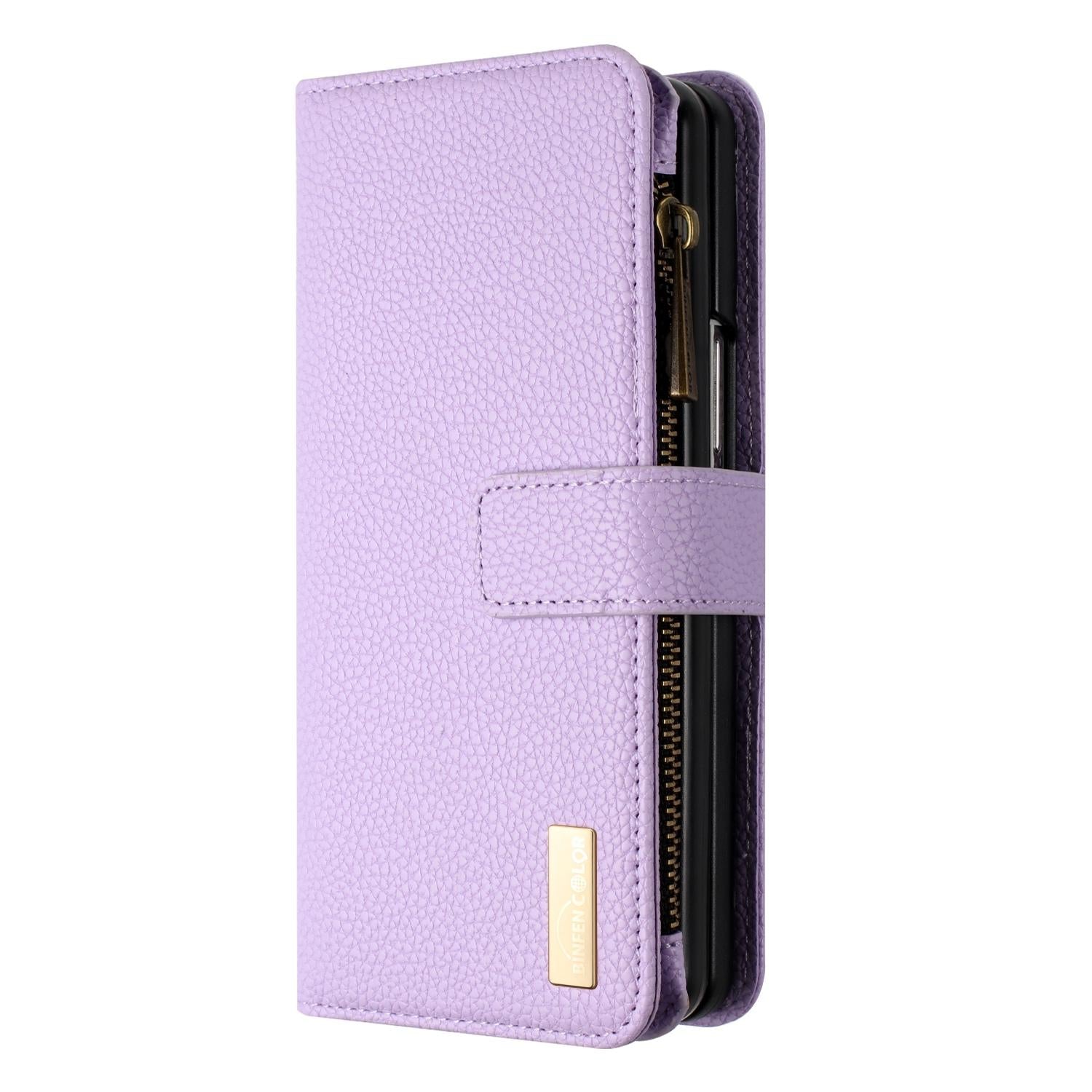 This product is a protective wallet case designed for a specific smartphone model. It features a textured surface and a zip closure, offering both style and security. The case provides comprehensive protection against scratches, dirt, and everyday wear, while also allowing easy access to all ports and buttons. Its design includes a holder for horizontal viewing, making it convenient for media consumption.